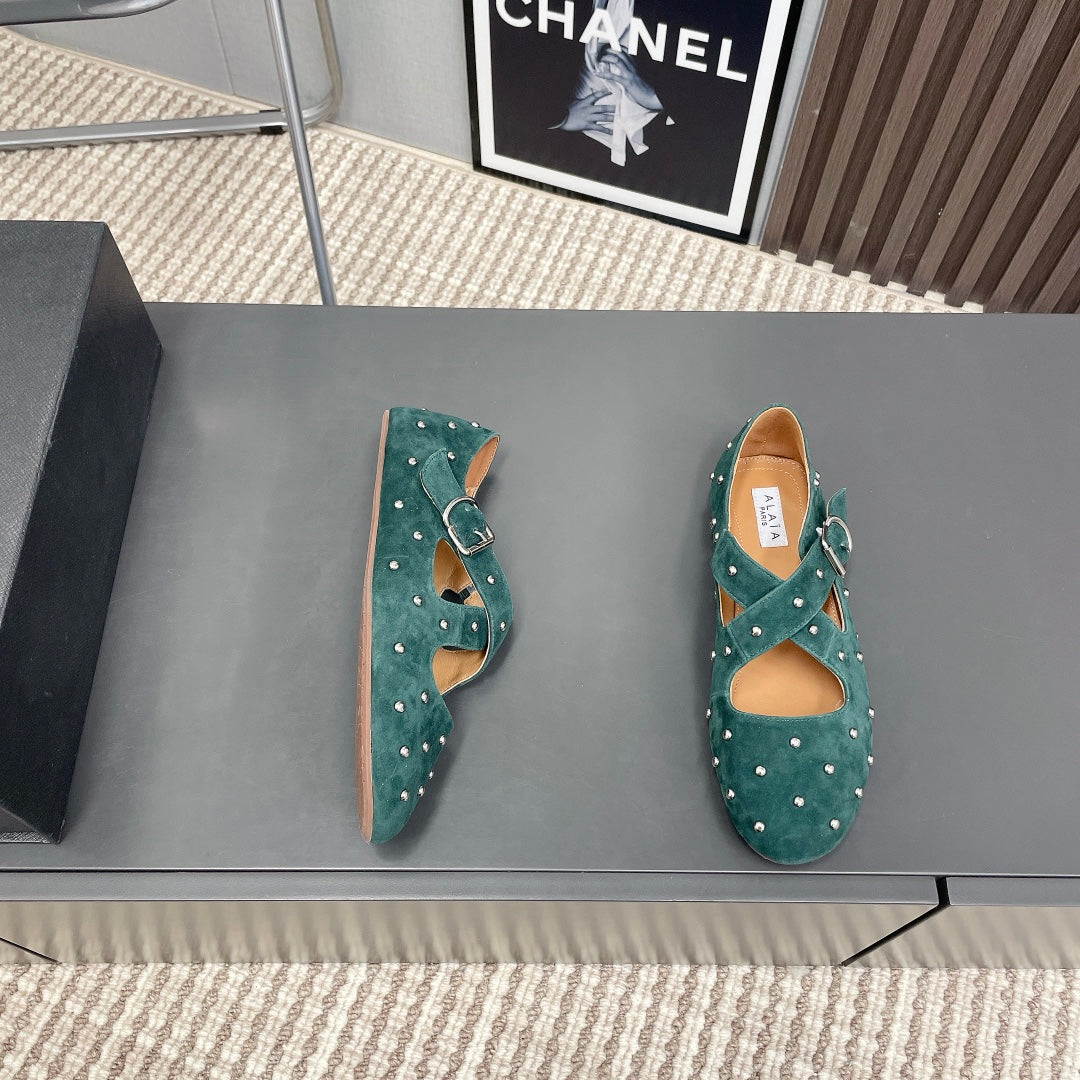 Alaia 2025 Criss Cross With Stud Ballet Flats Emerald Green Suede 293208