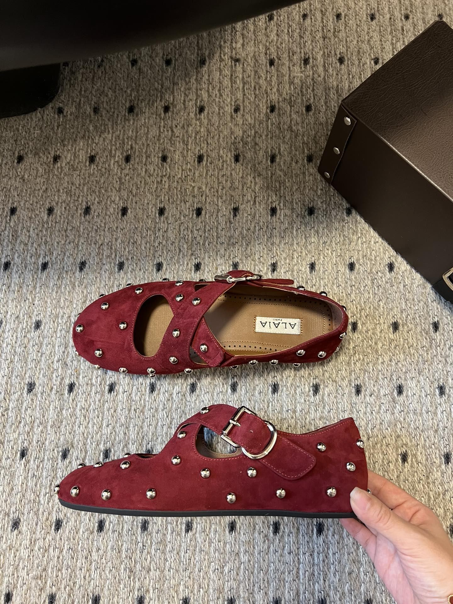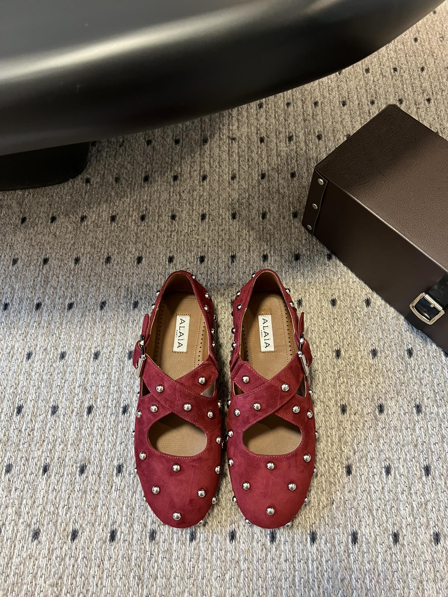 Alaia 25 Criss Cross With Stud Ballet Flats Ruby Red Suede Sheepskin 303690