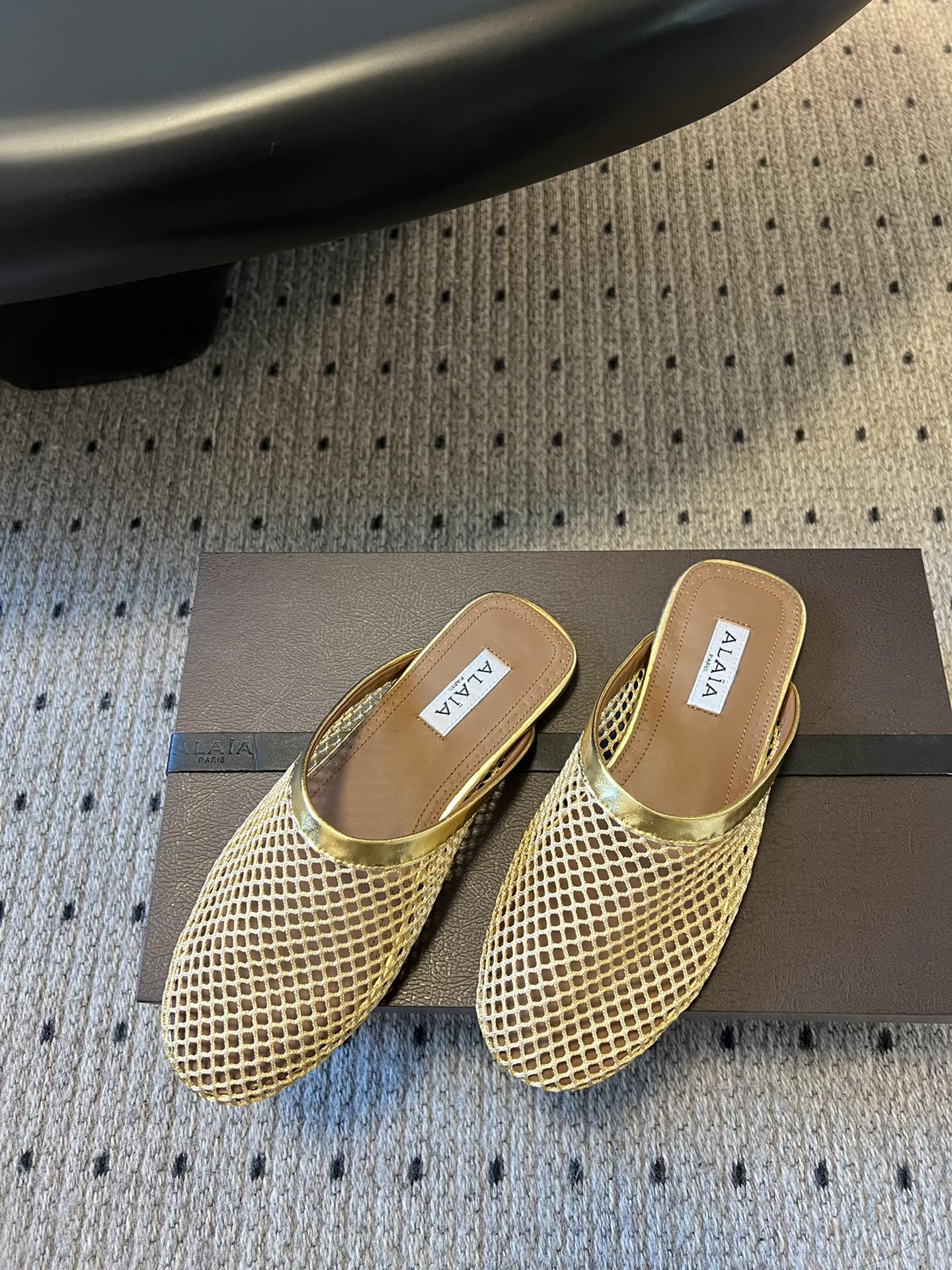 Alaia 25 Fishnet Flat Mules Gold Lampskin 303680