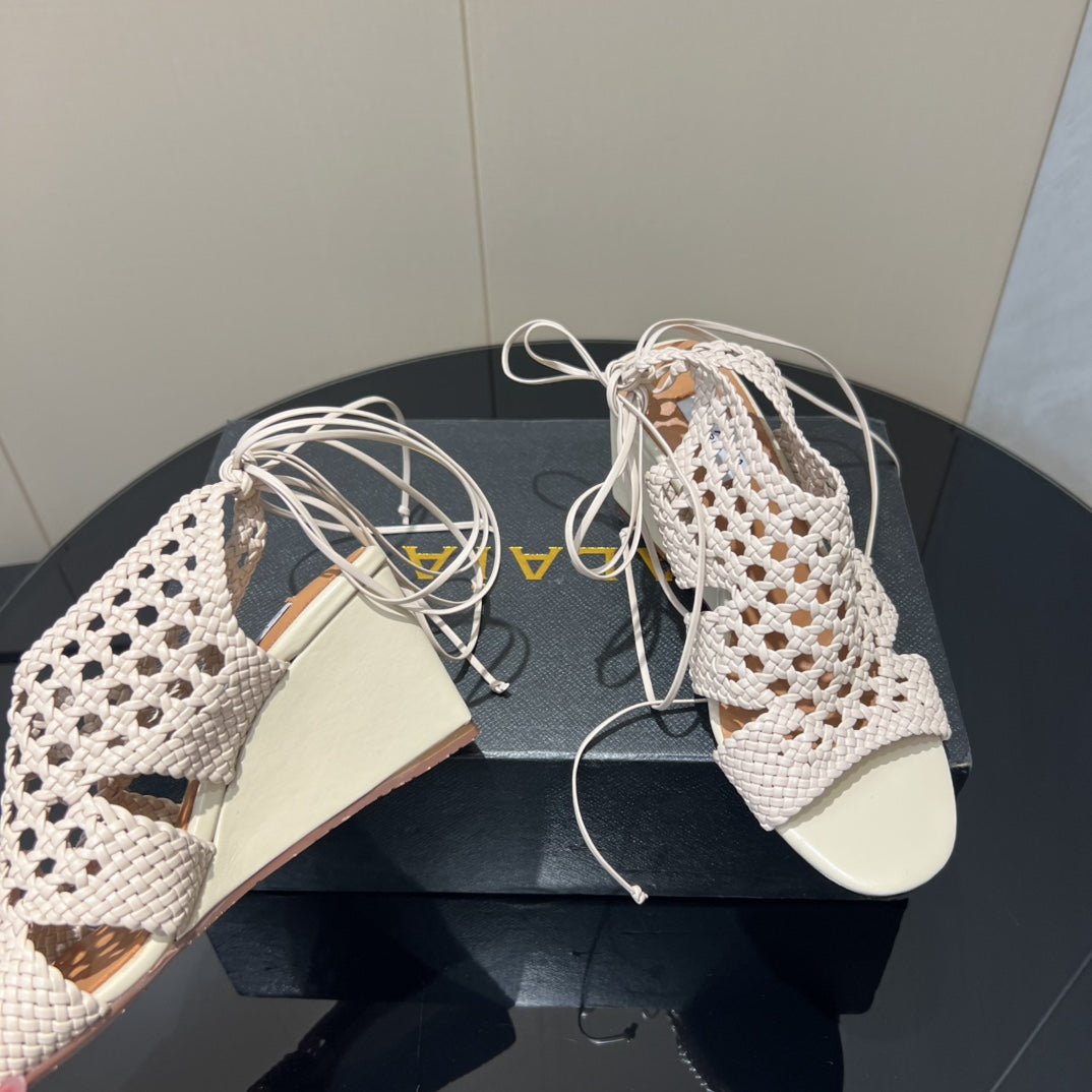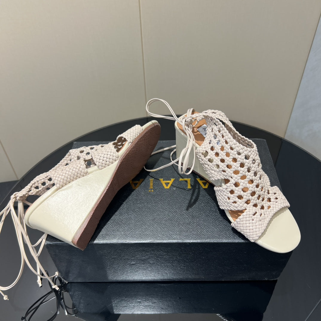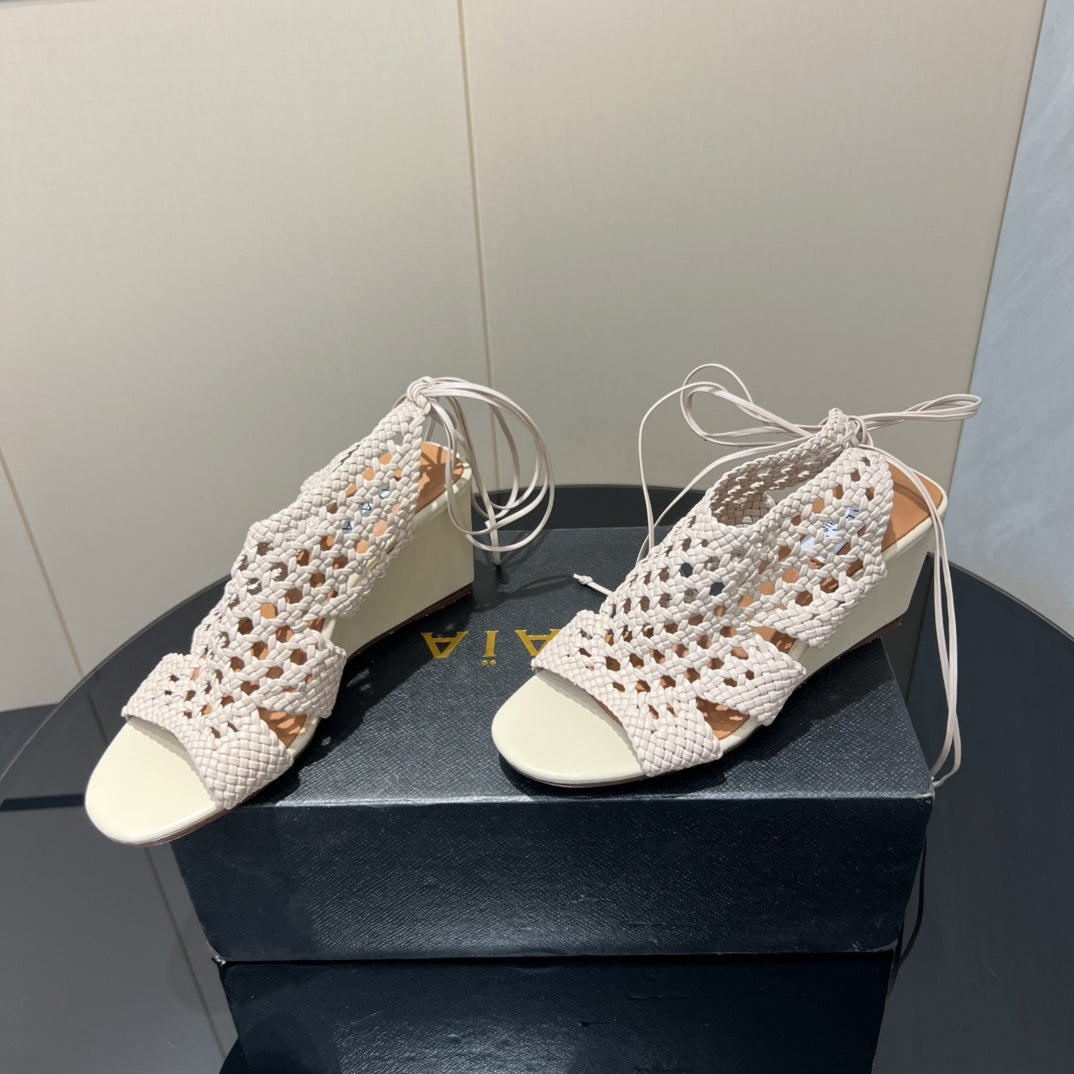 Alaia 25 Round-toe Braided Wedge Sandals 75mm Flamingo Woven Leather433568
