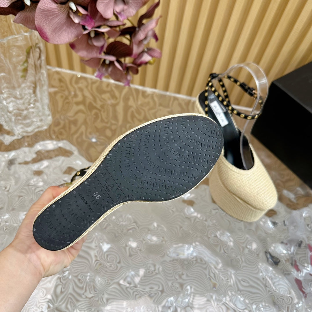 ALAIA LA WEDGE SANDALS IN WHITE PAPER STRAW
