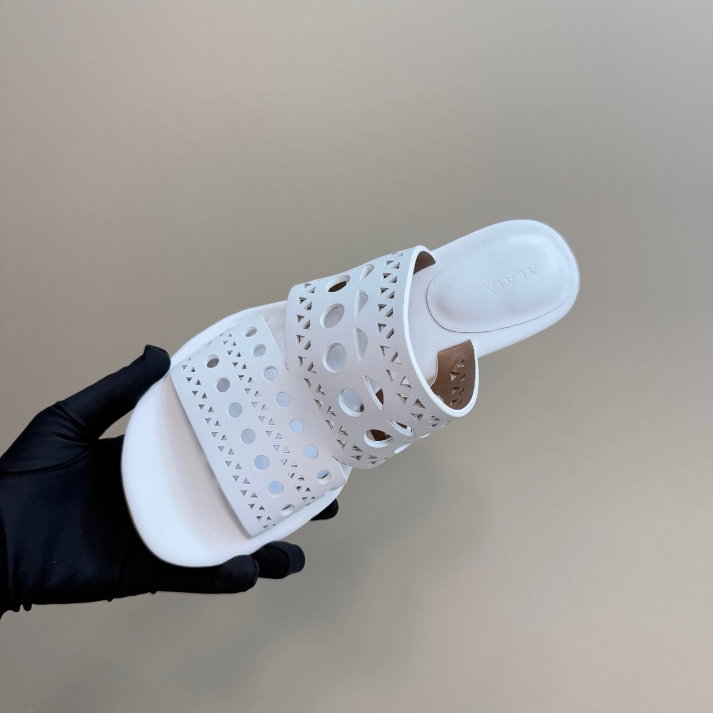 Alaia Vienne Cutout Kitten-Heel Slide Sandals White Sheepskin 299663