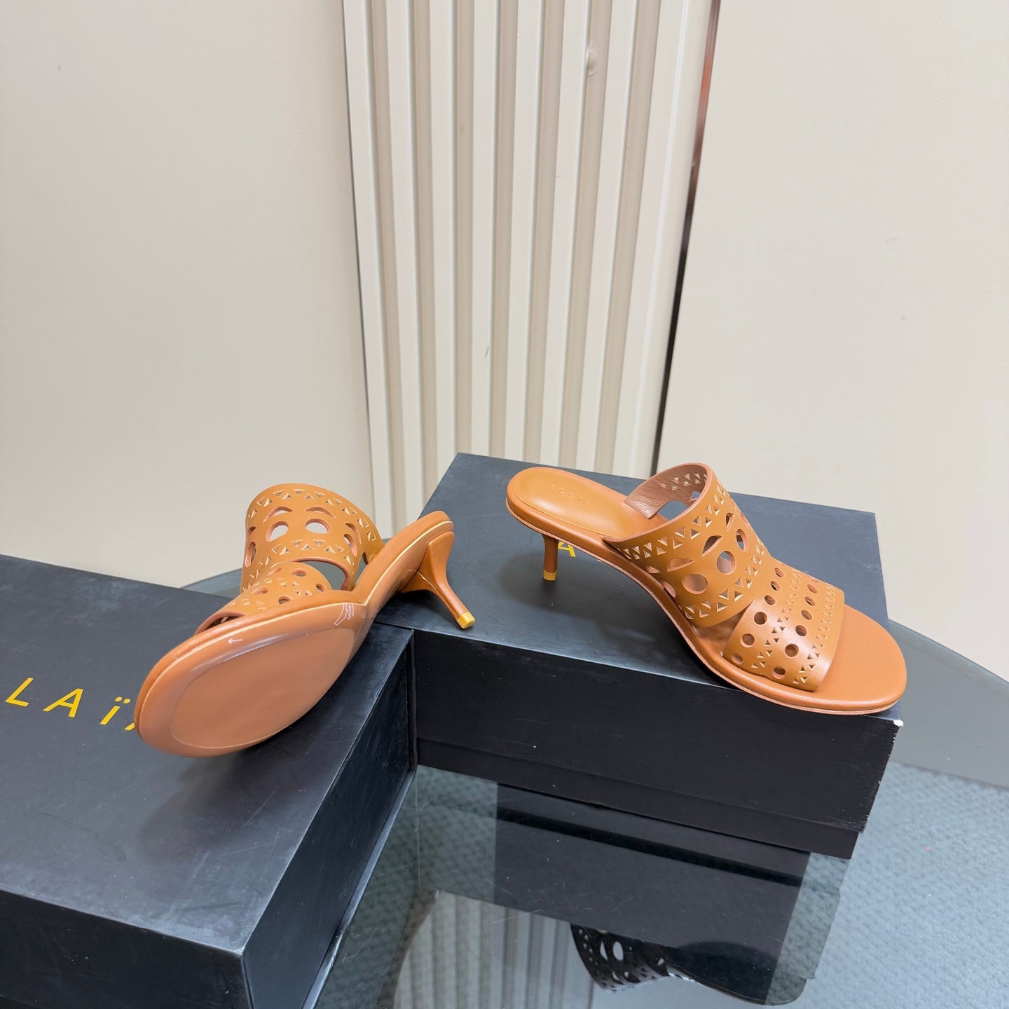 Alaia 2025 Vienne Cutout Kitten-Heel Slide Sandals Brown Leather 293649