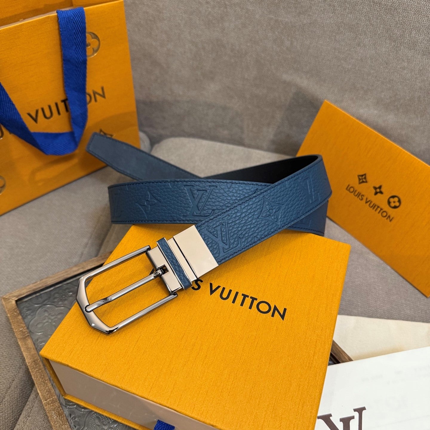 LV Slender Men Belt 35mm Deep Blue Embossed Monogram Leather Sliver HW