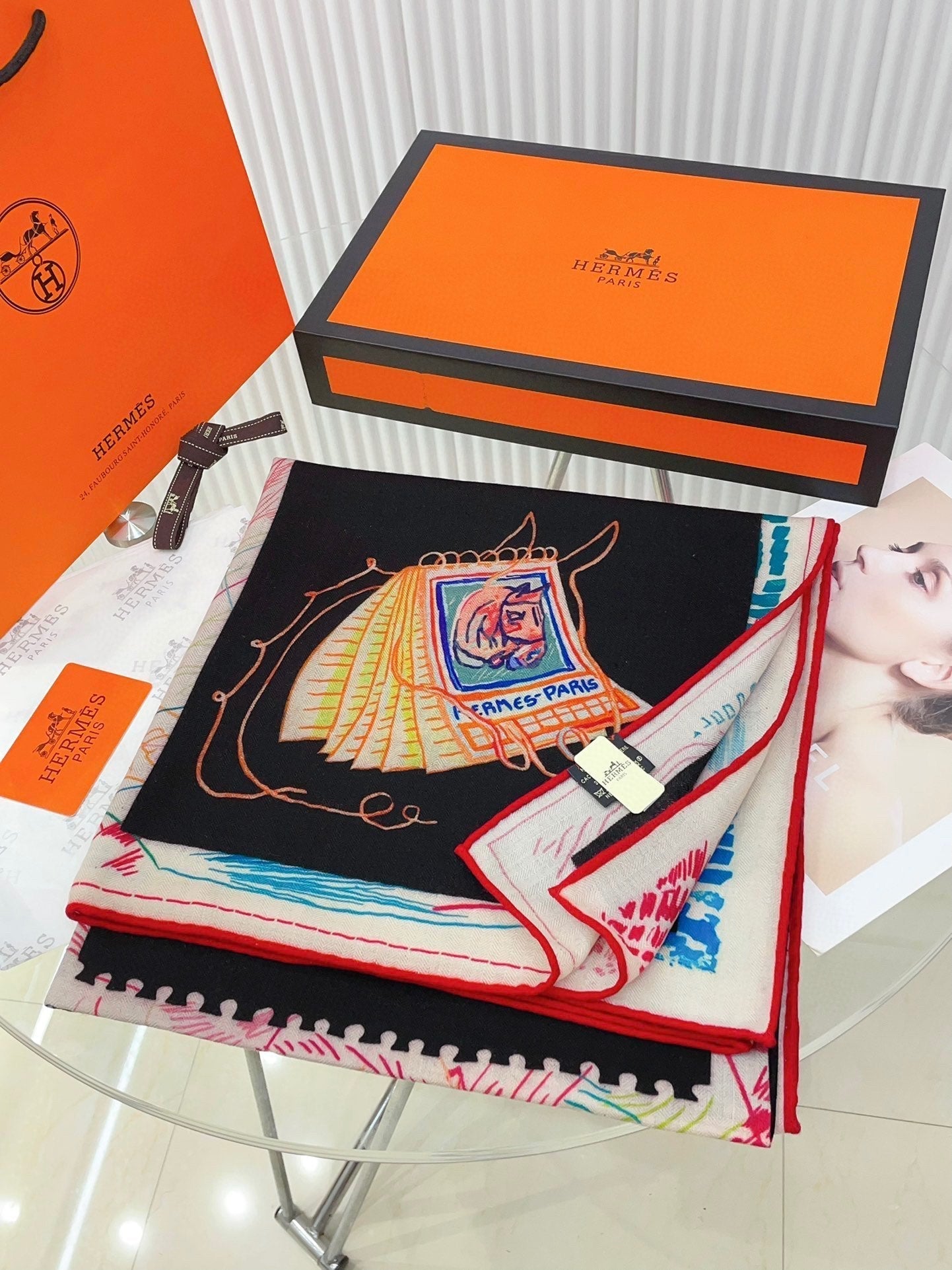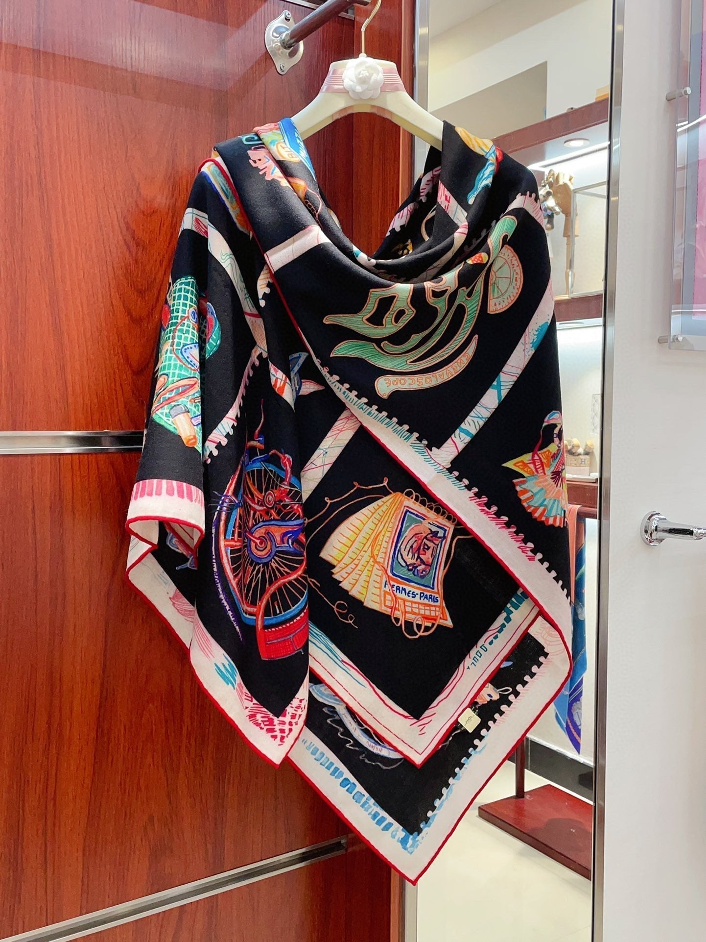Chevaloscope Scarf 140 CM In Black Colorful Cashmere And Silk 373661