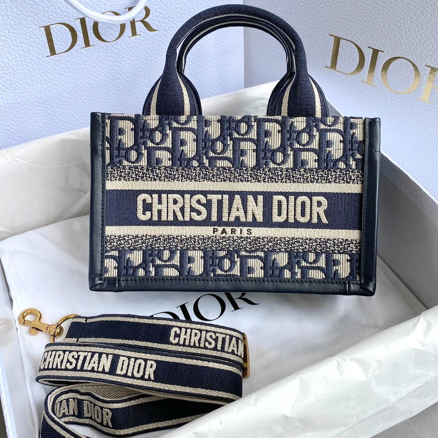 MINI BOOK TOTE 21 BLUE OBLIQUE EMBROIDERY