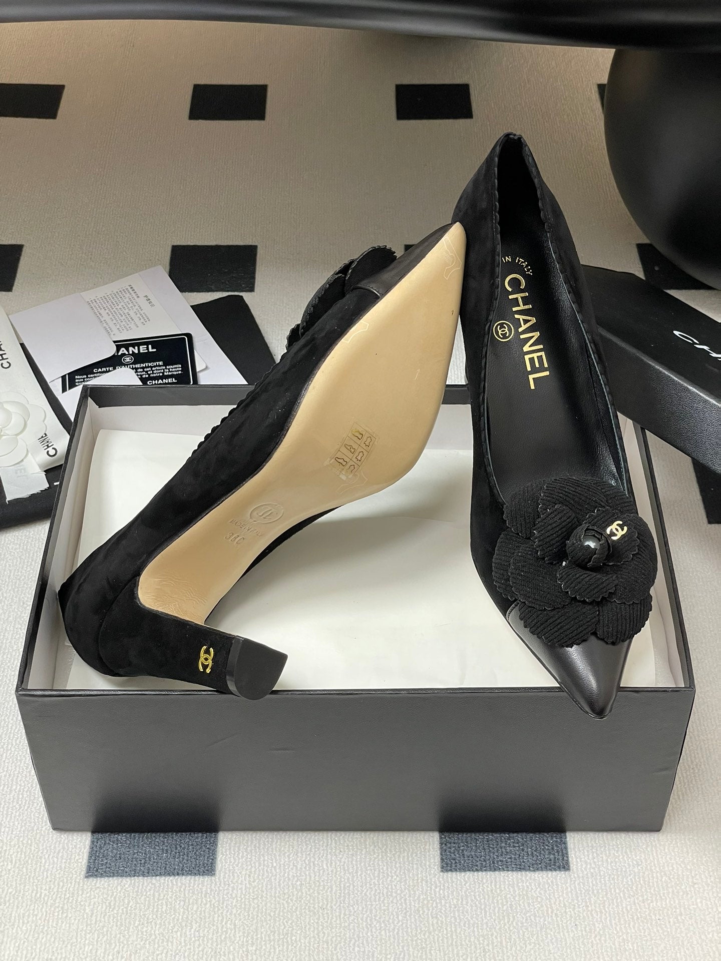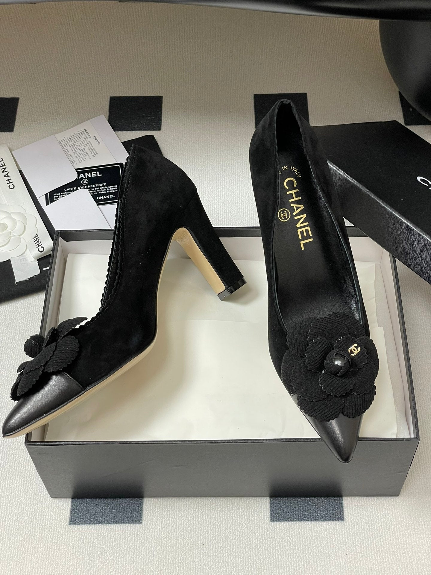 CC 25C Classic Camellia Pointed High Heels Pump 85mm Black Suede 247617