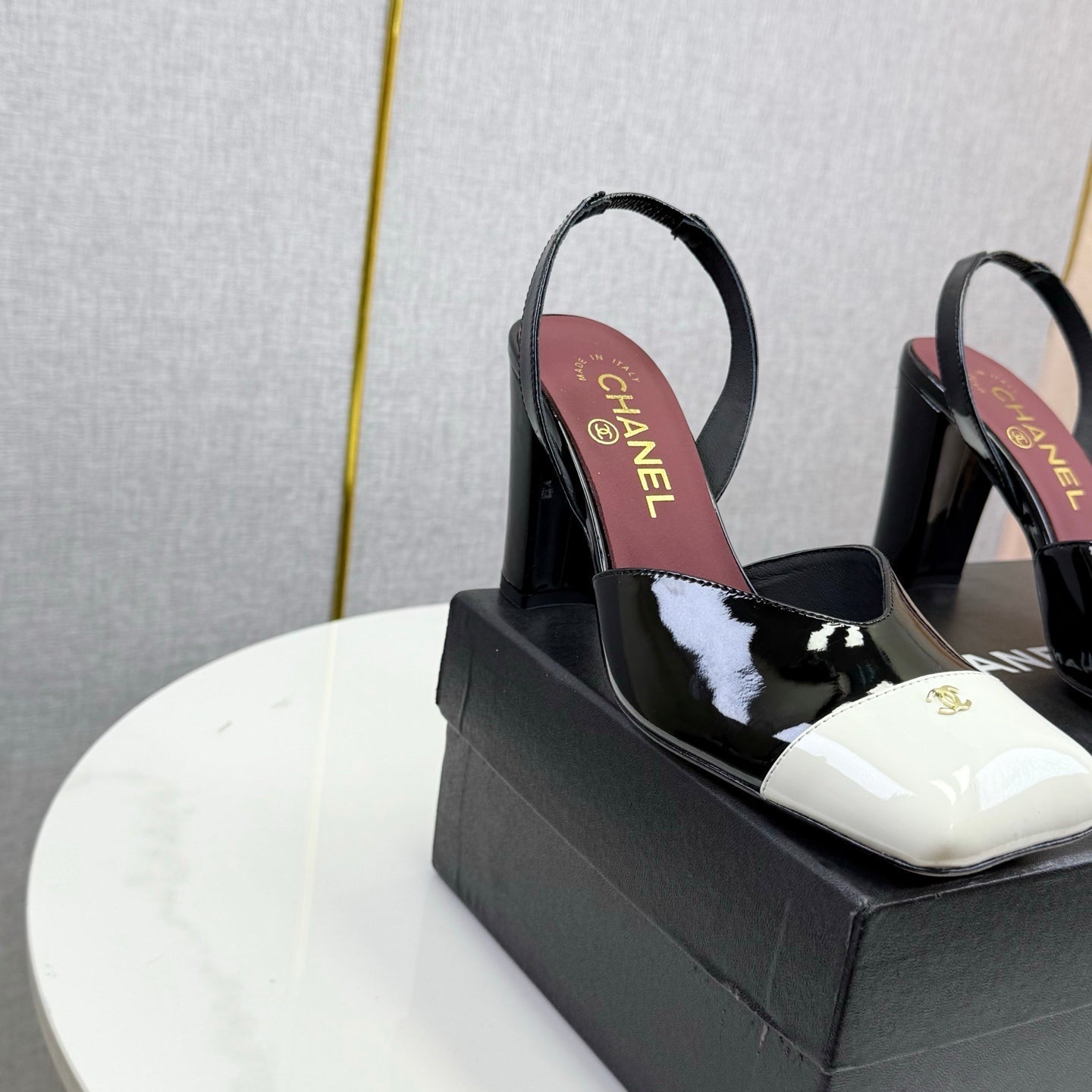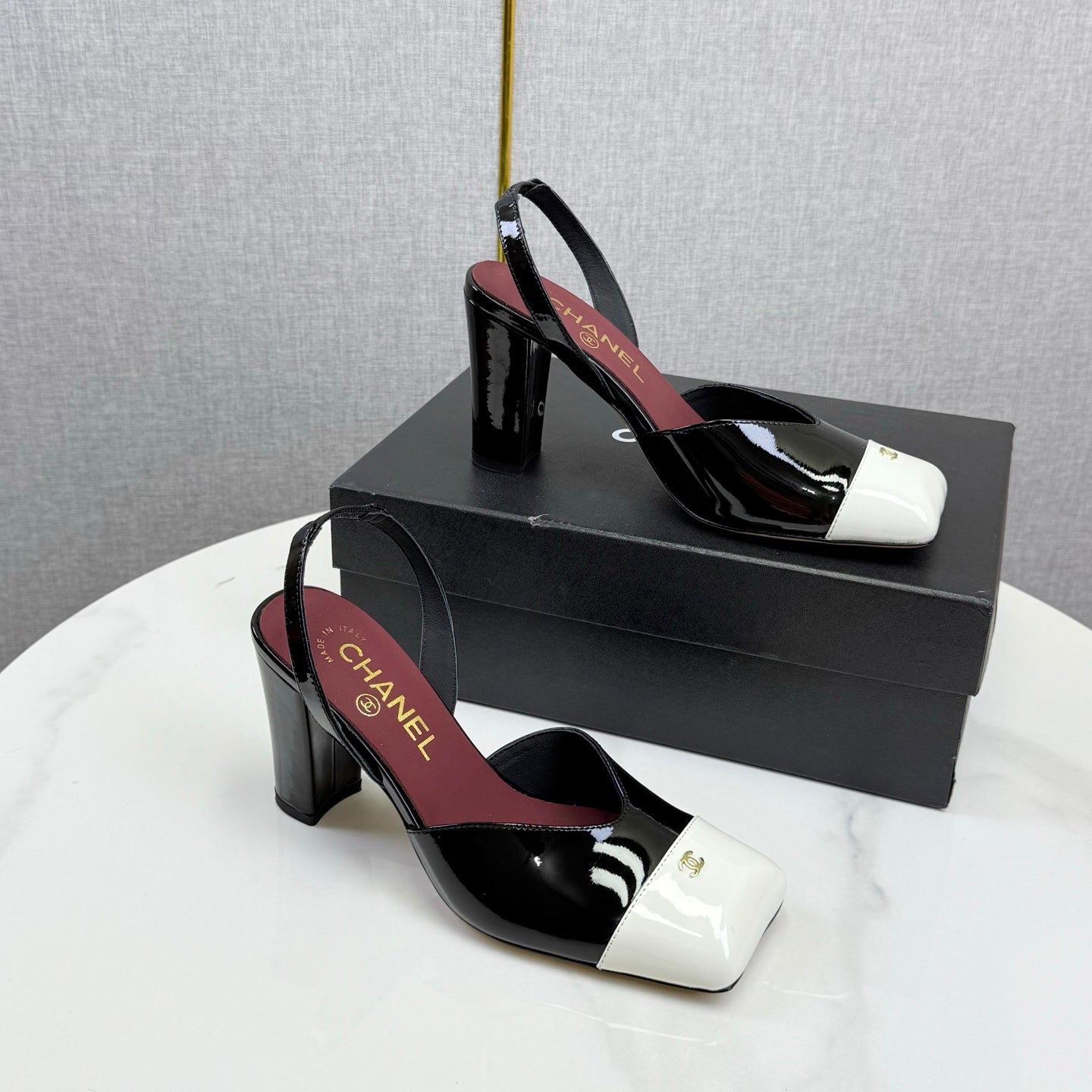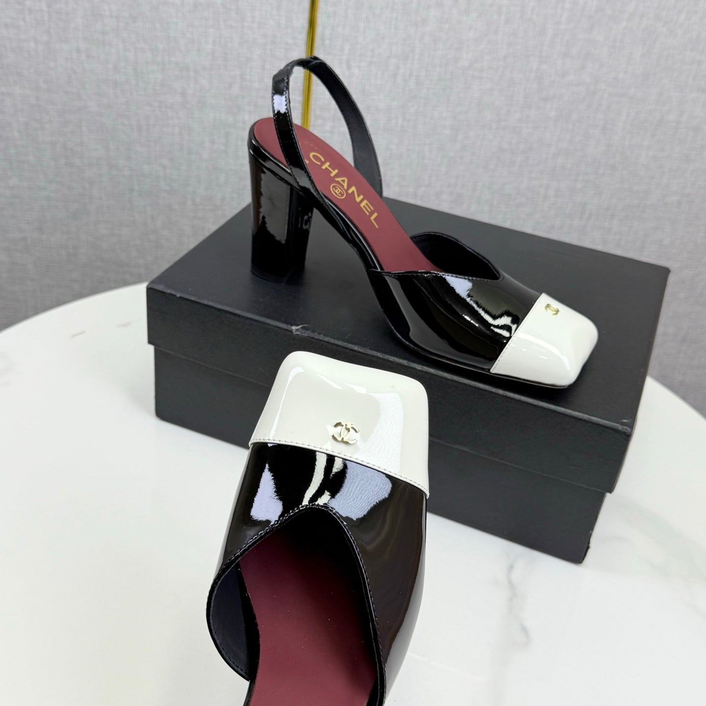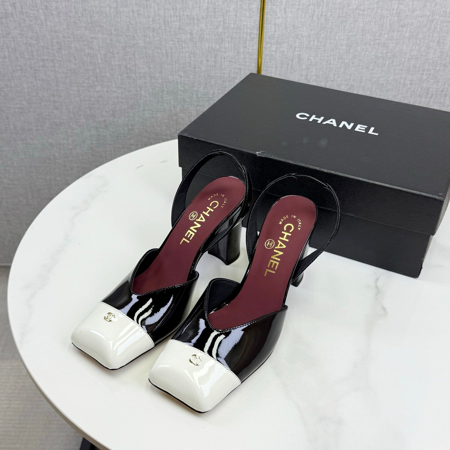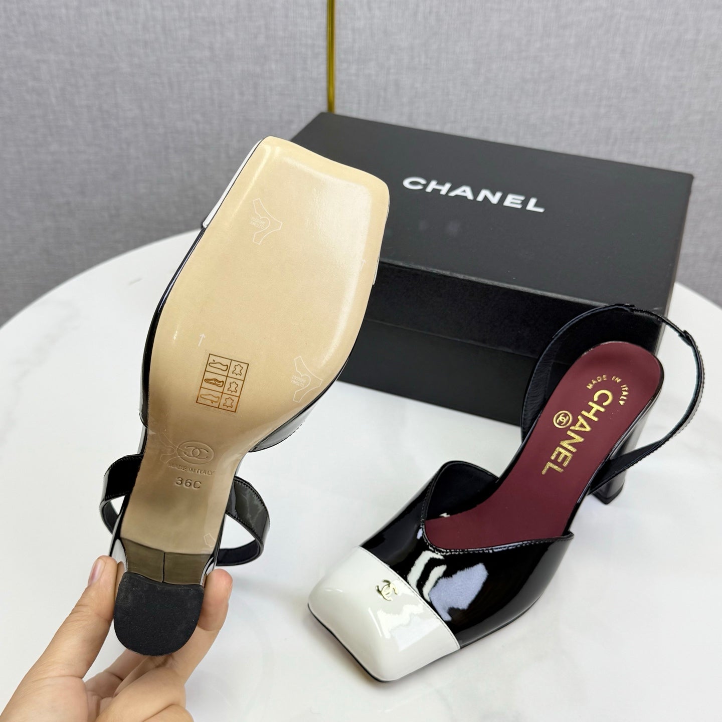 CC 25FW Square Toe Slingback Black White Patent Leather 541133