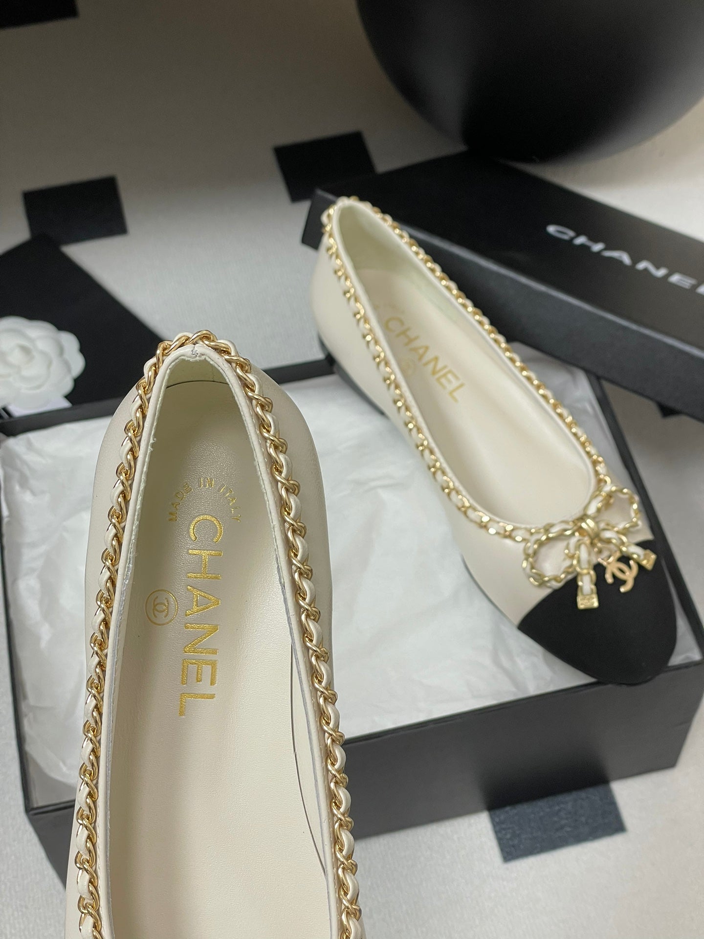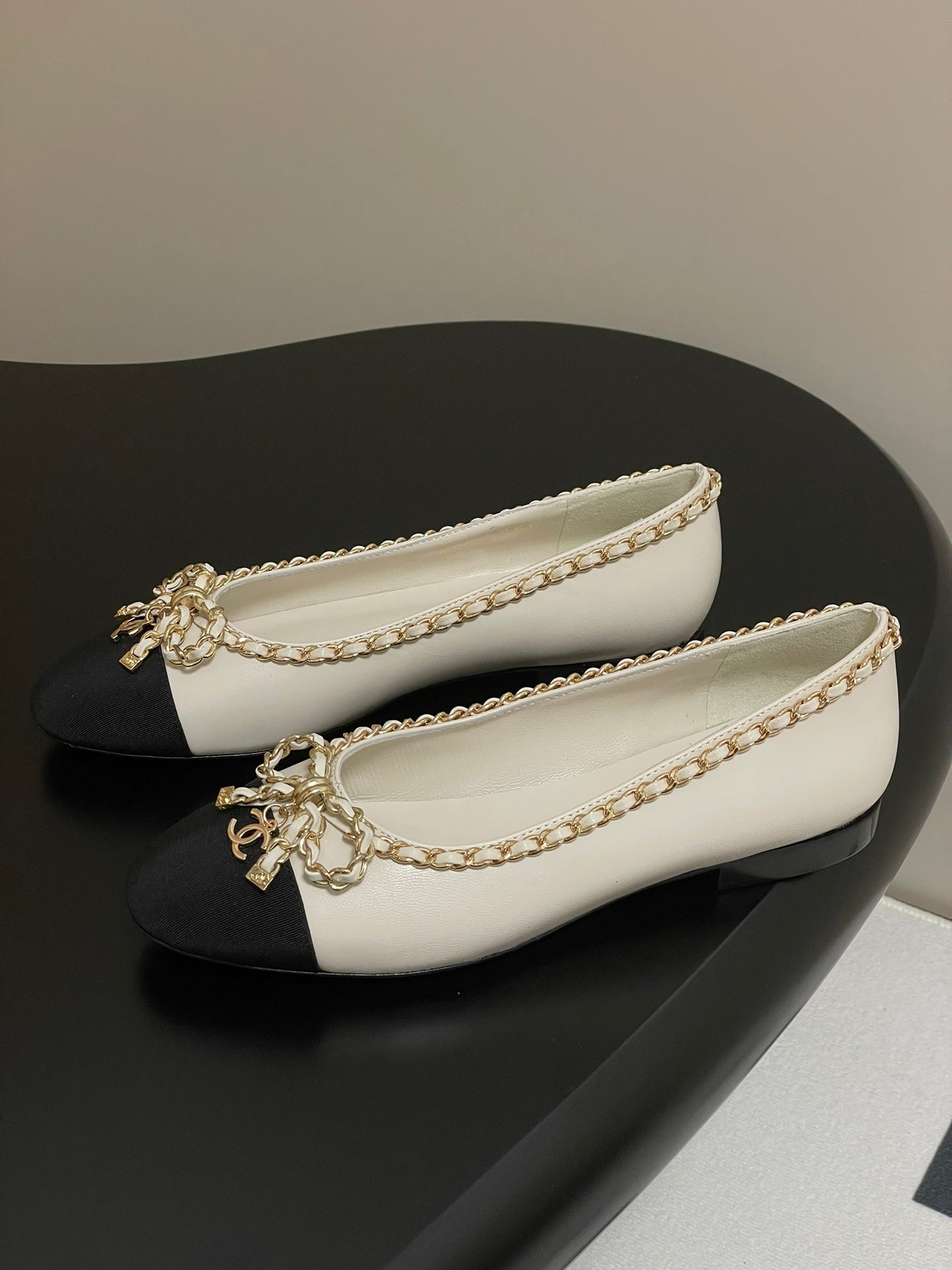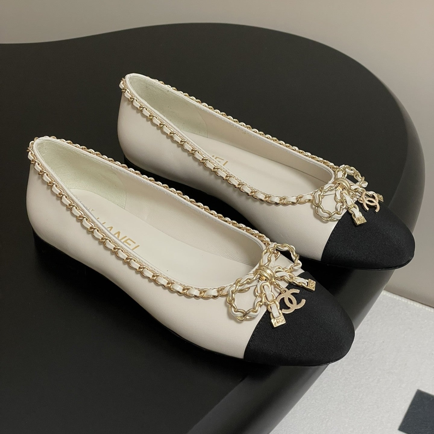 CC 25S 20mm Chain Bow Single Flat White Sheepskin Black Grosgrain 247655