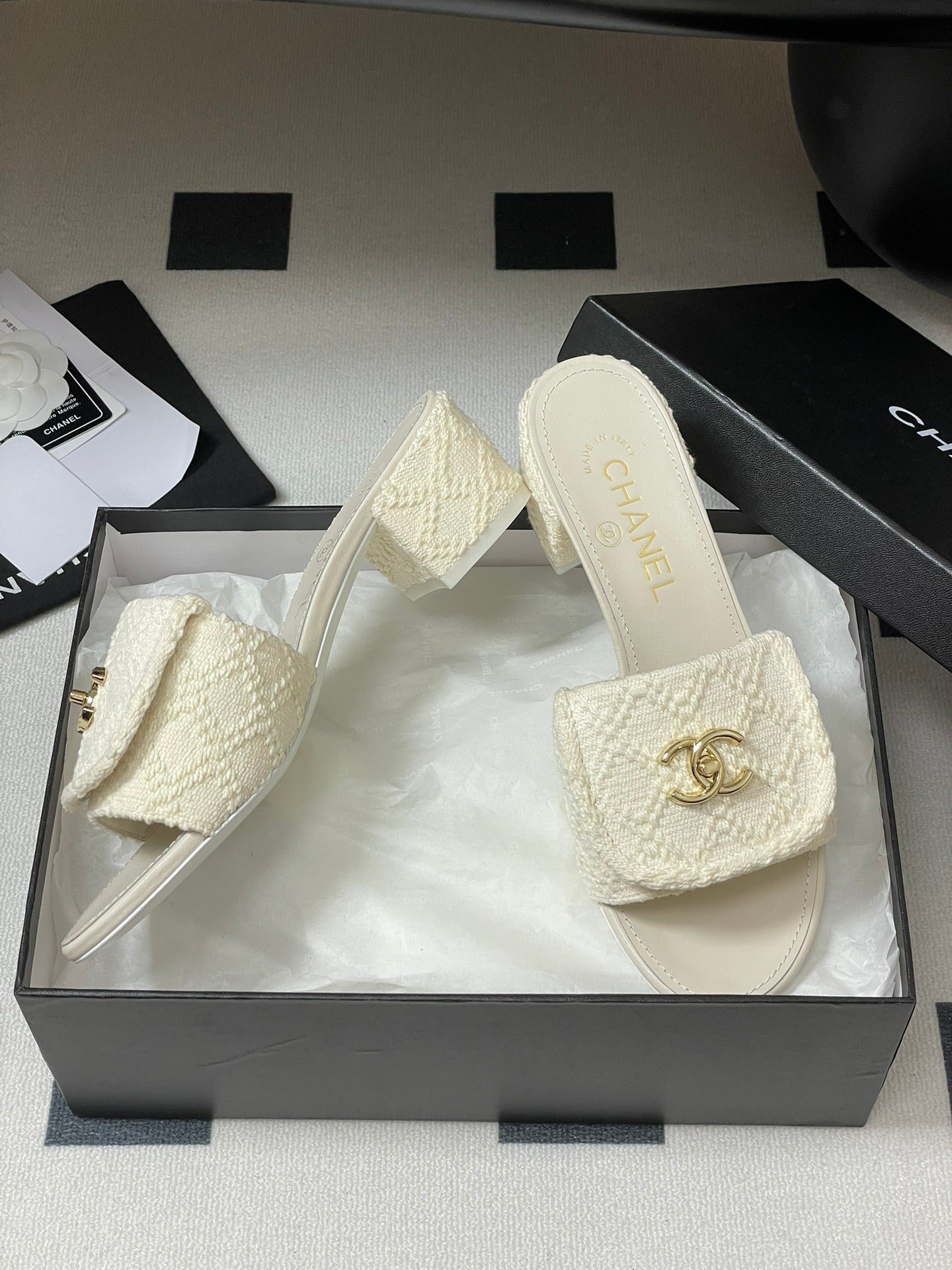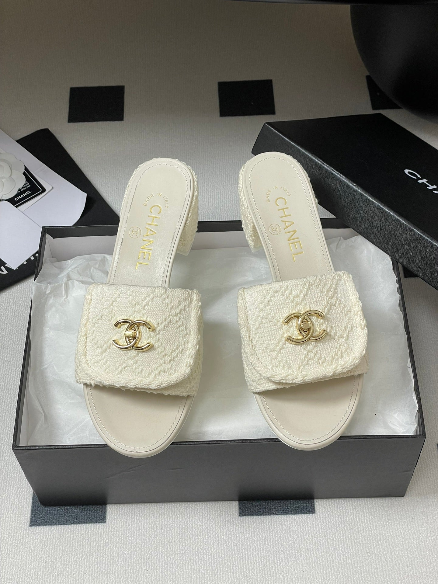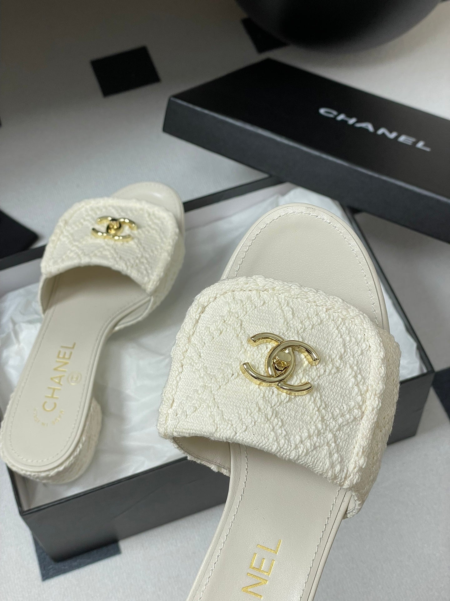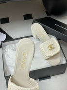CC 25S Buckle Bag Mule Sandal 50mm White Fabric and Sheepskin 247601