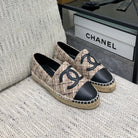 ESPADRILLE CAMEL BEIGE TWEED FABRIC AND BLACK CALFSKIN FLATS