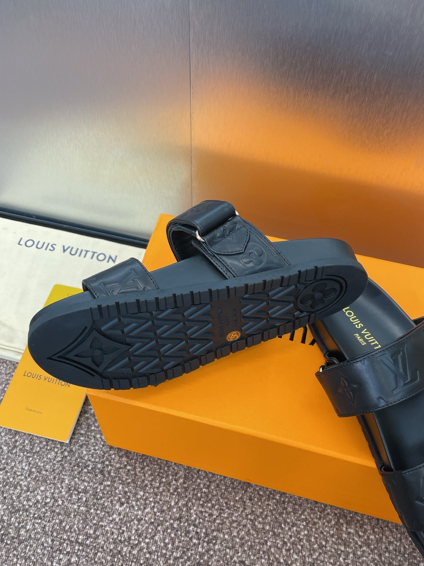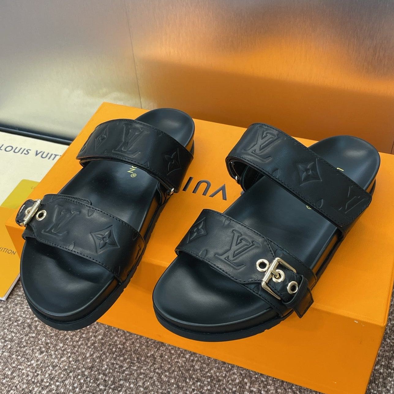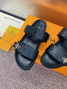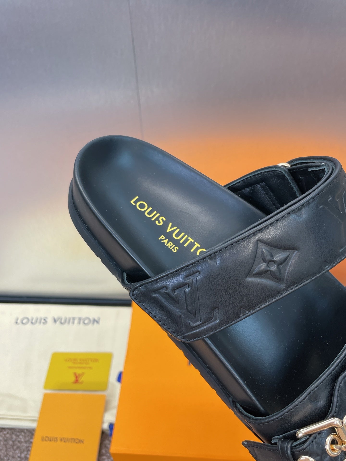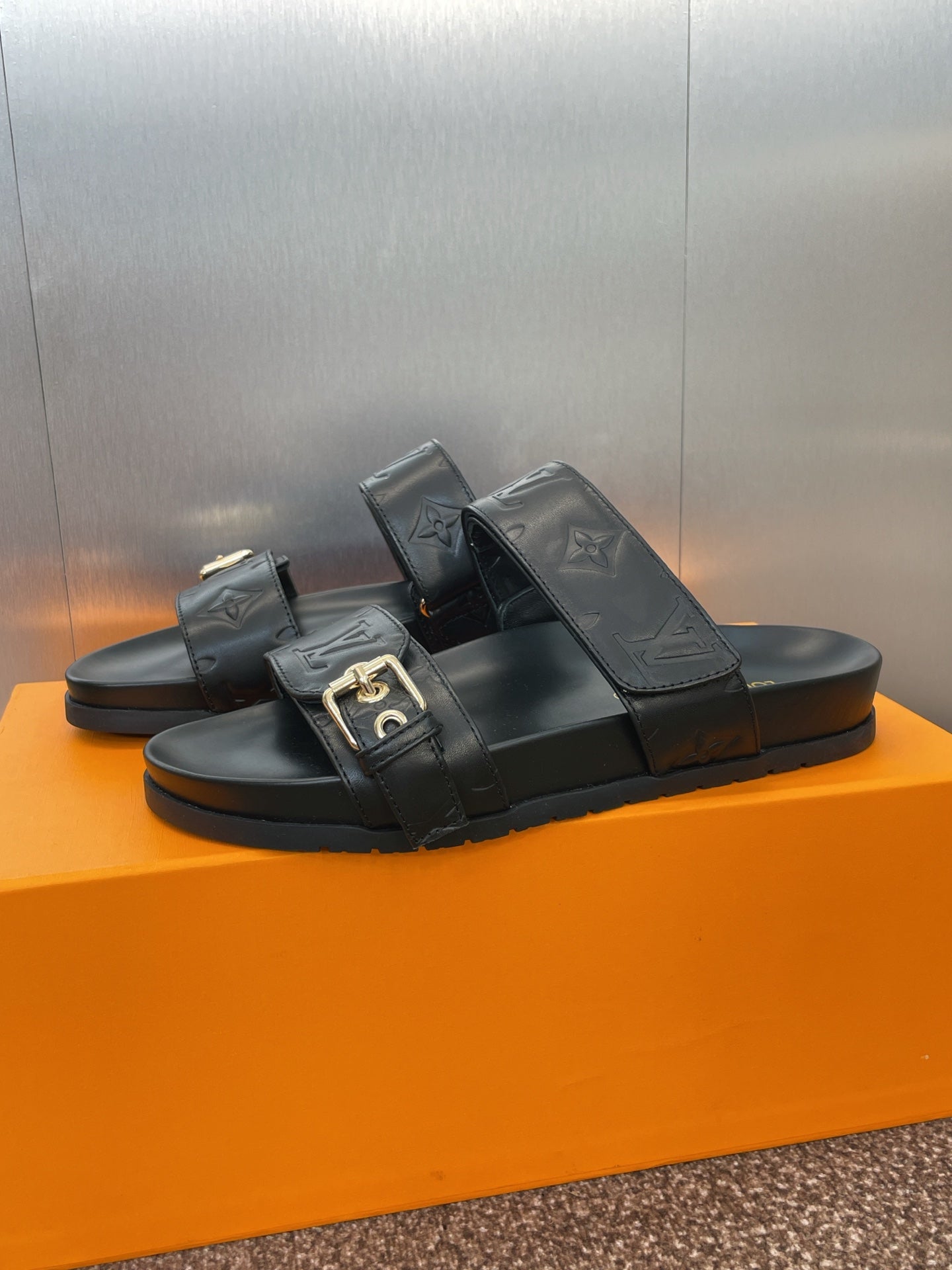 LV 2025 Hardware Buckle Open-toe Sandal Black Gold Cowhide 330223