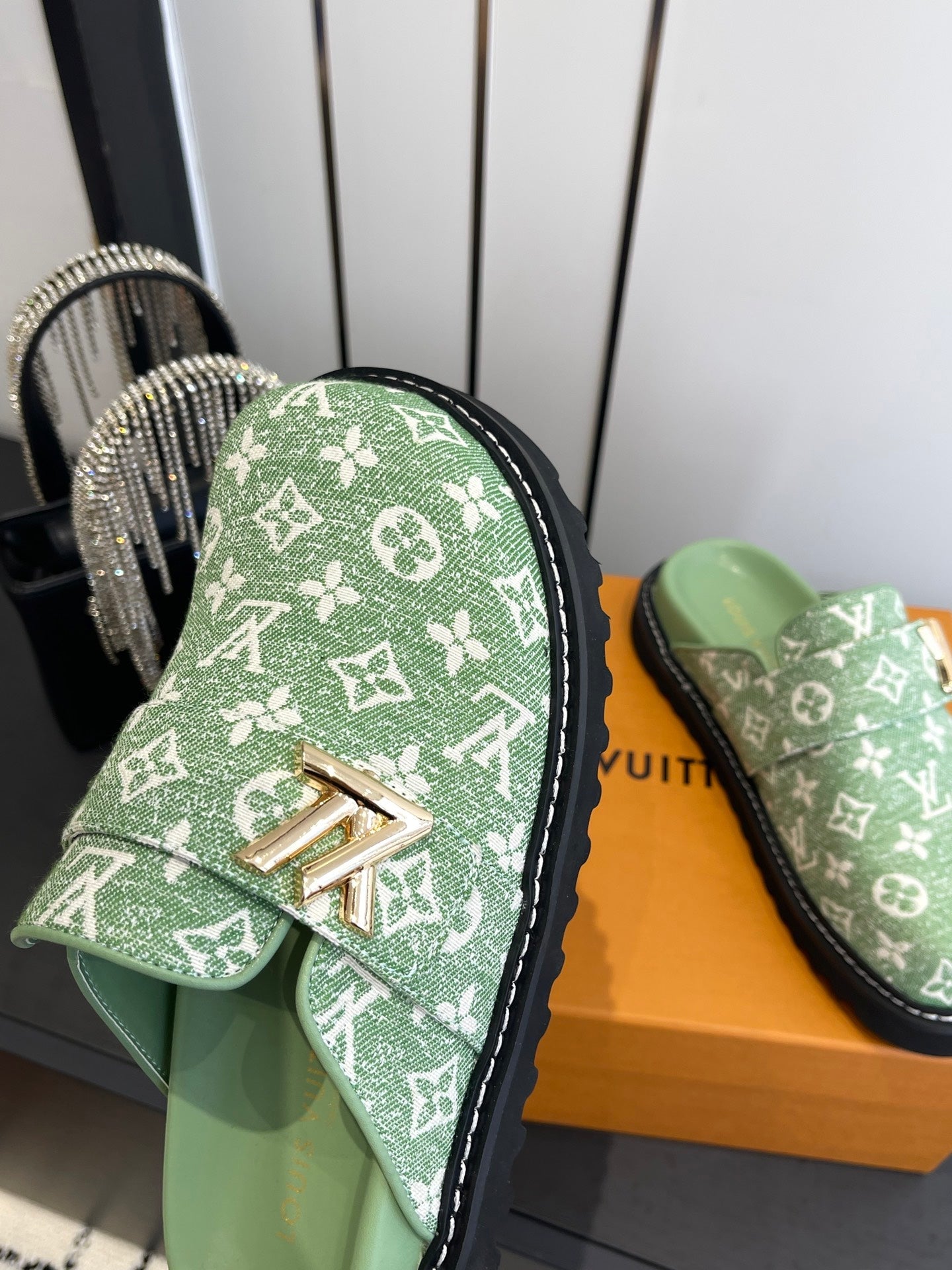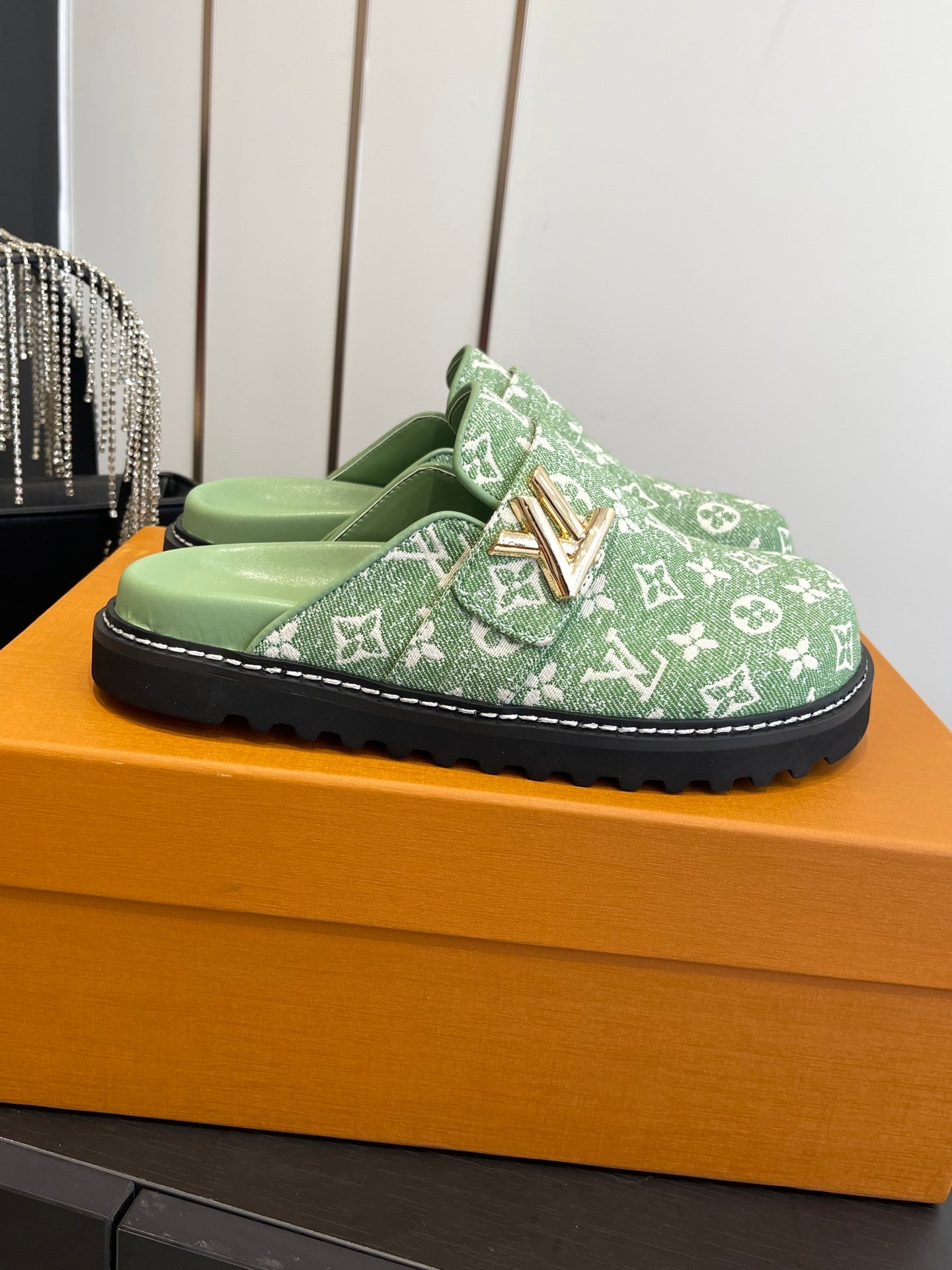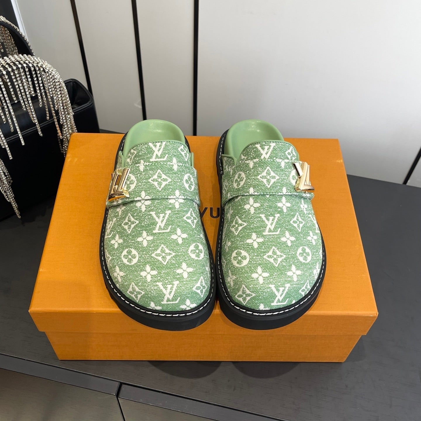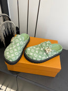 LV Cosy Comfort Mule Sandals Green Gold Denim Monogrammed 533458