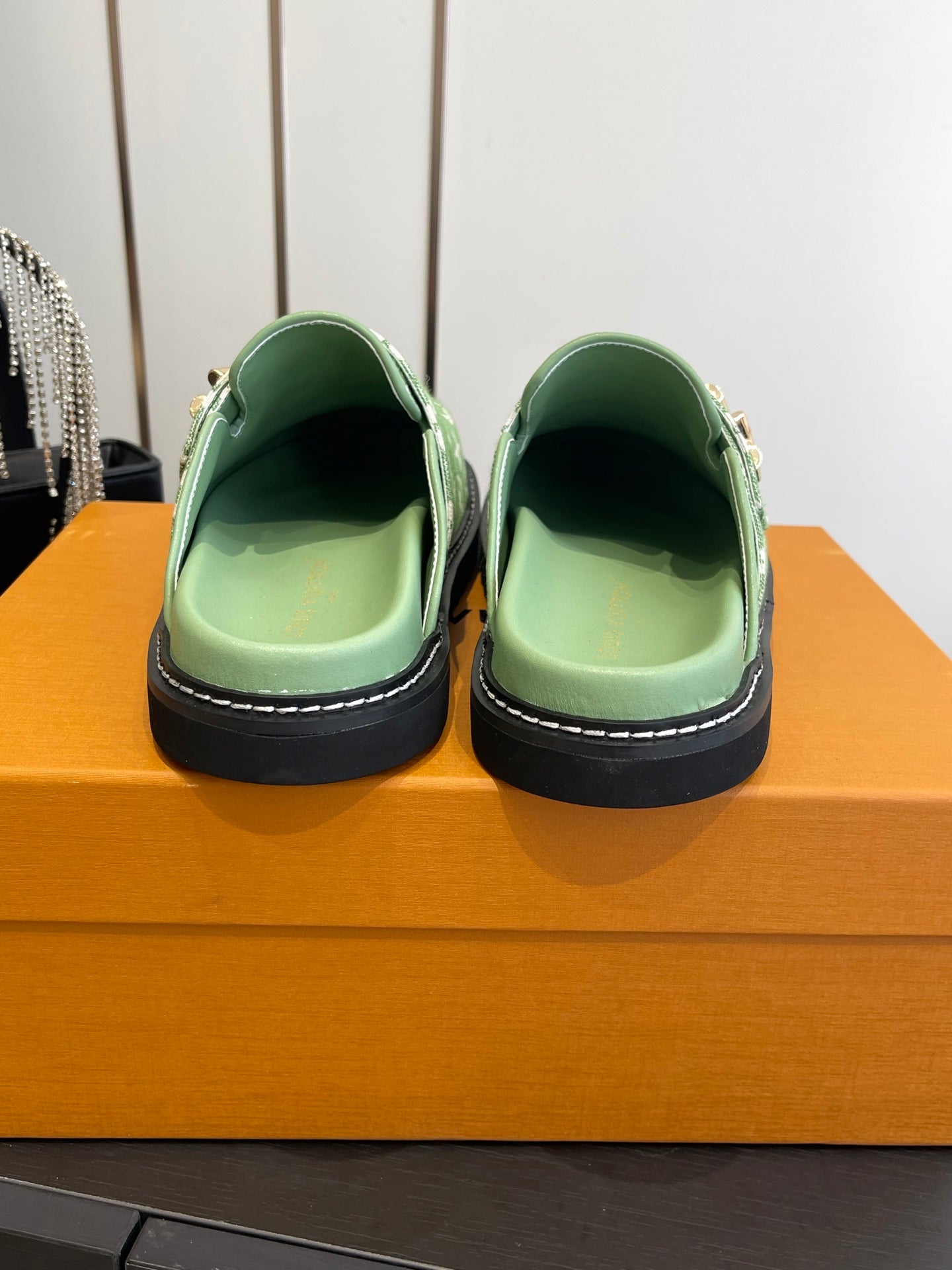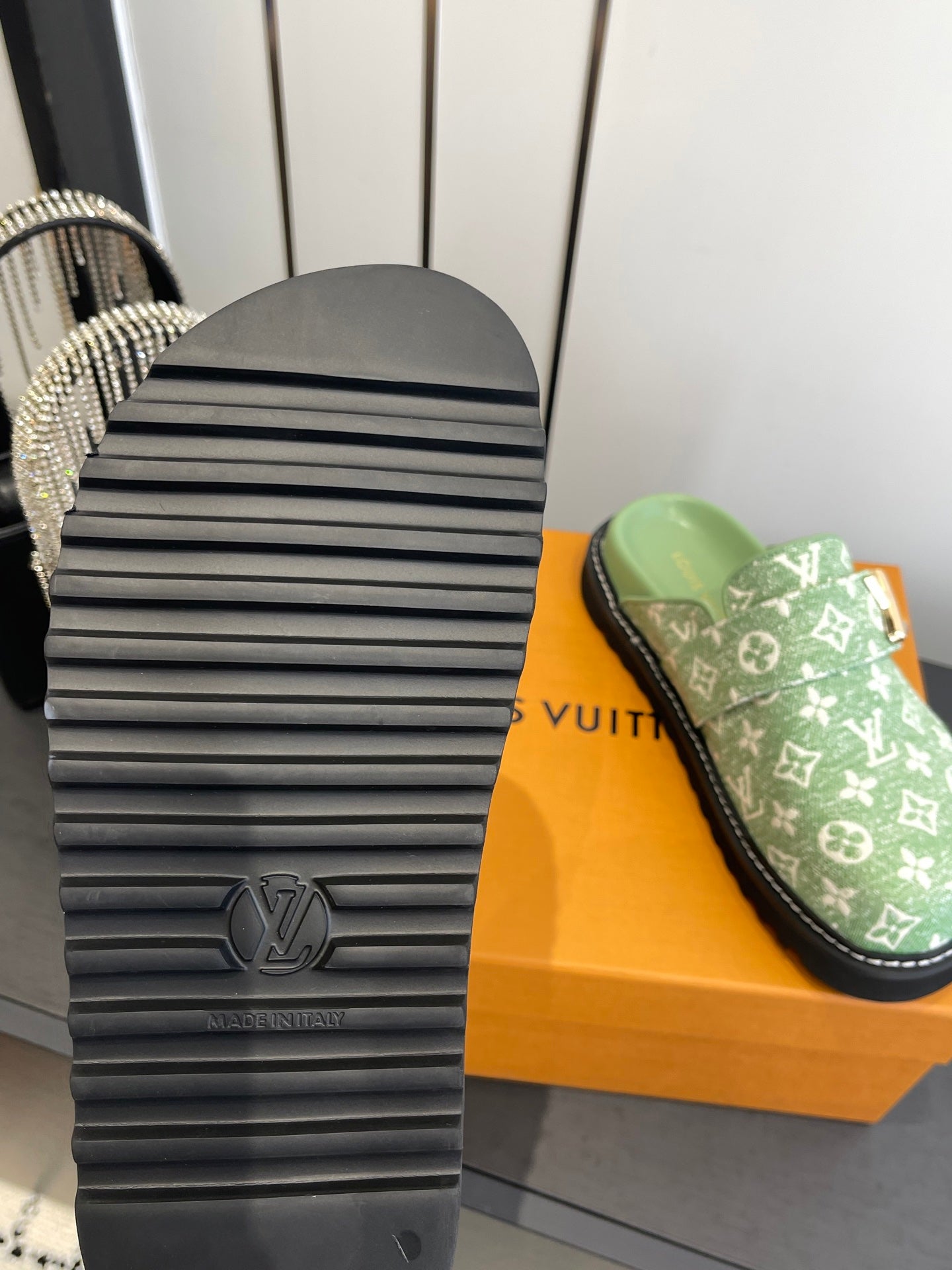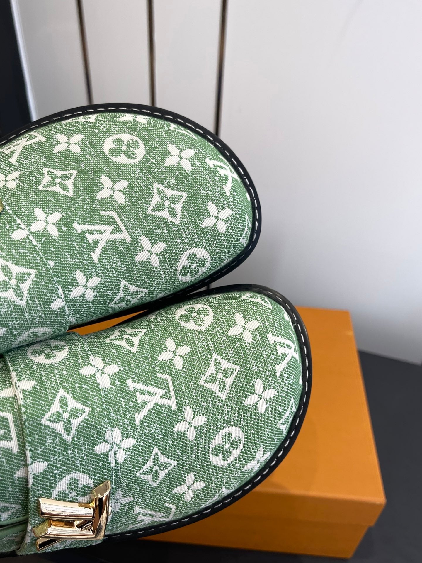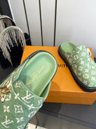 LV Cosy Comfort Mule Sandals Green Gold Denim Monogrammed 533458