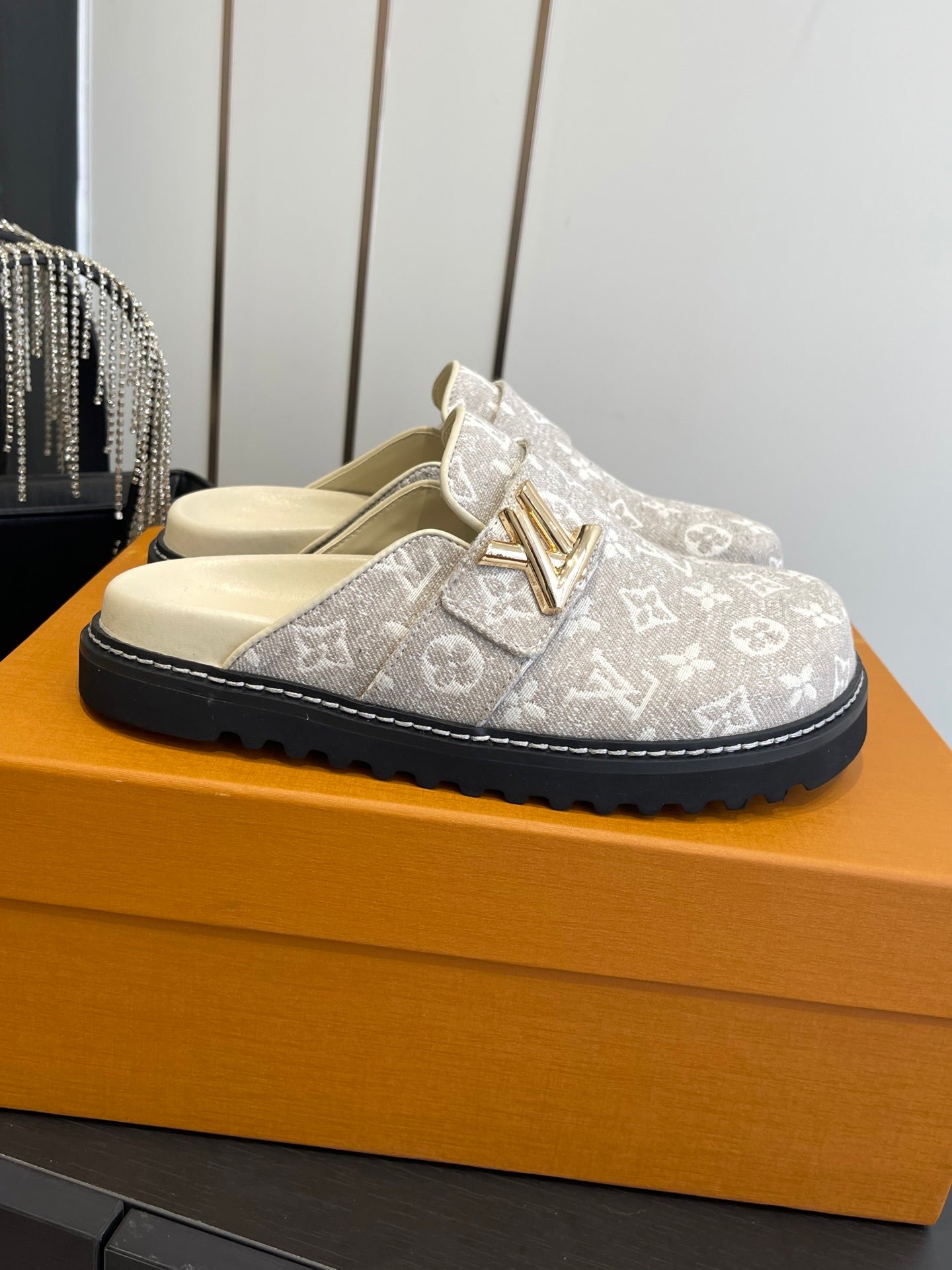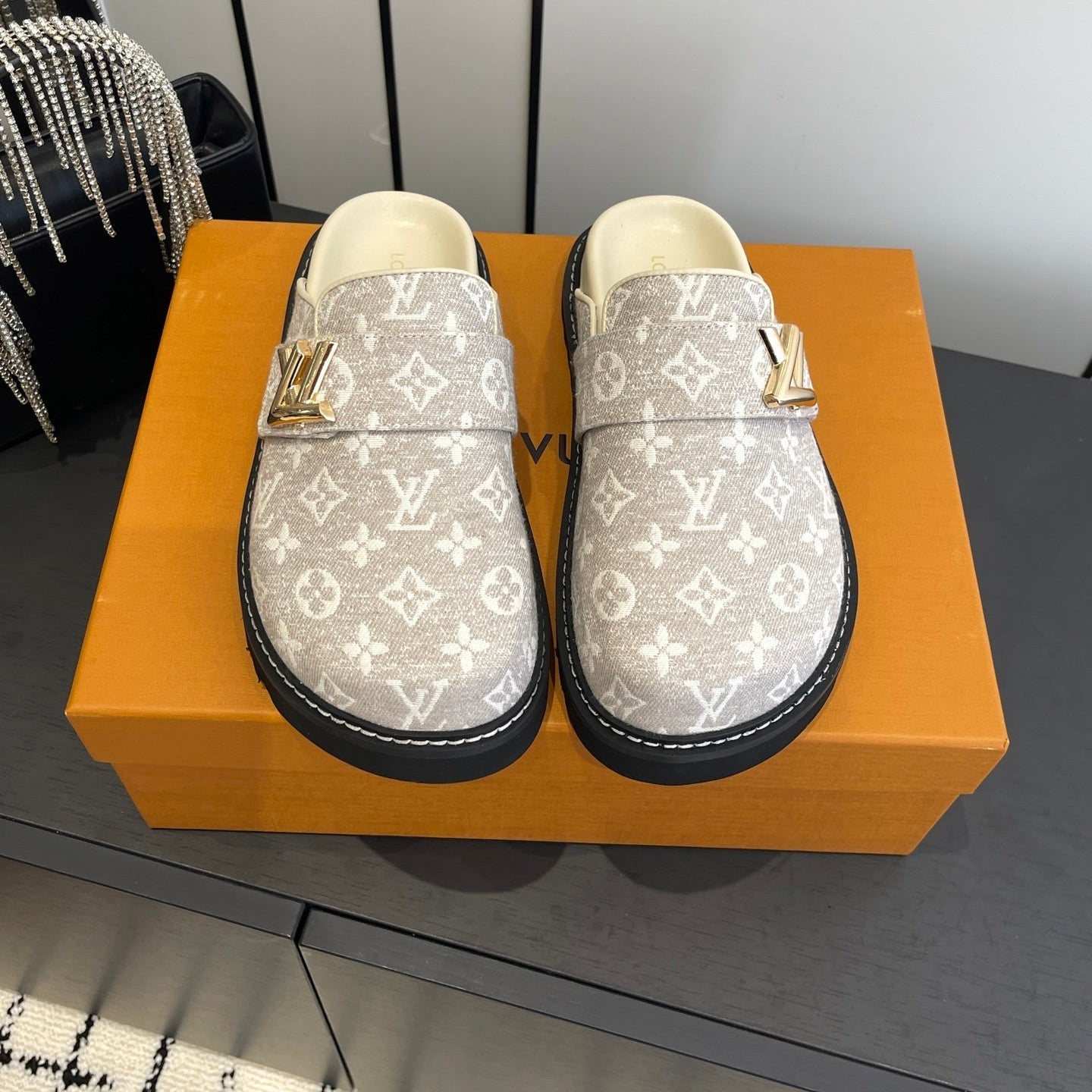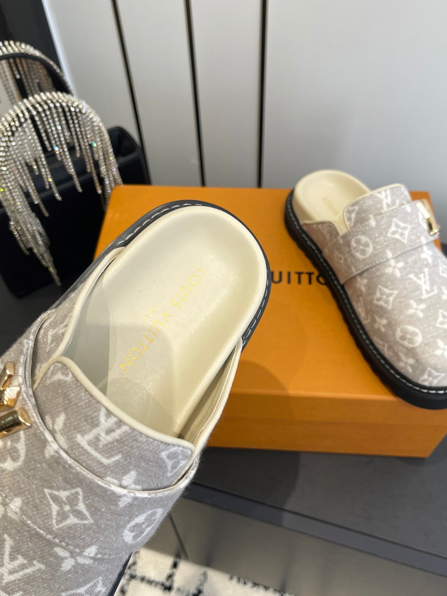 LV Cosy Comfort Mule Sandals Lighe Beige Gold Denim Monogrammed 533462