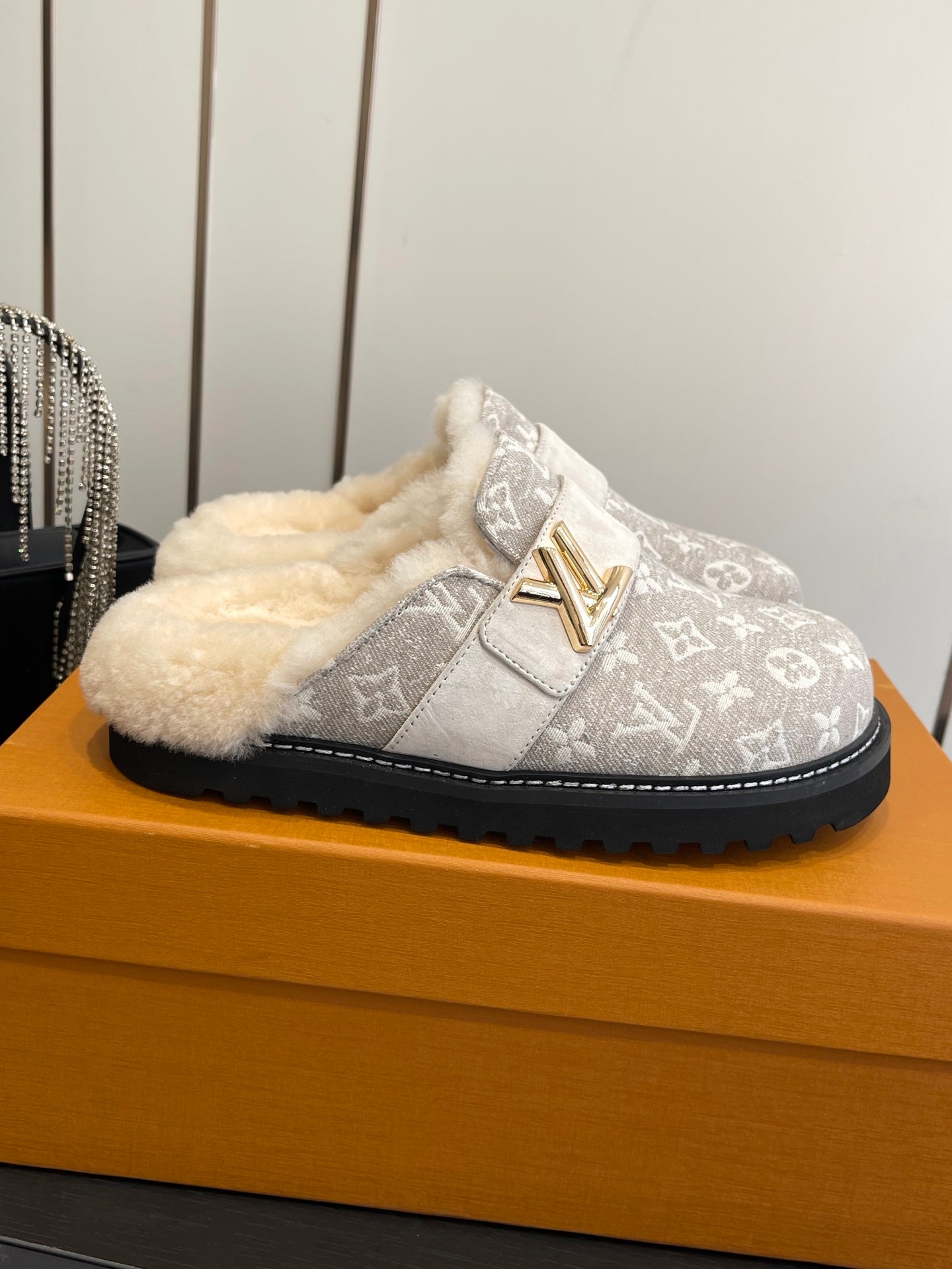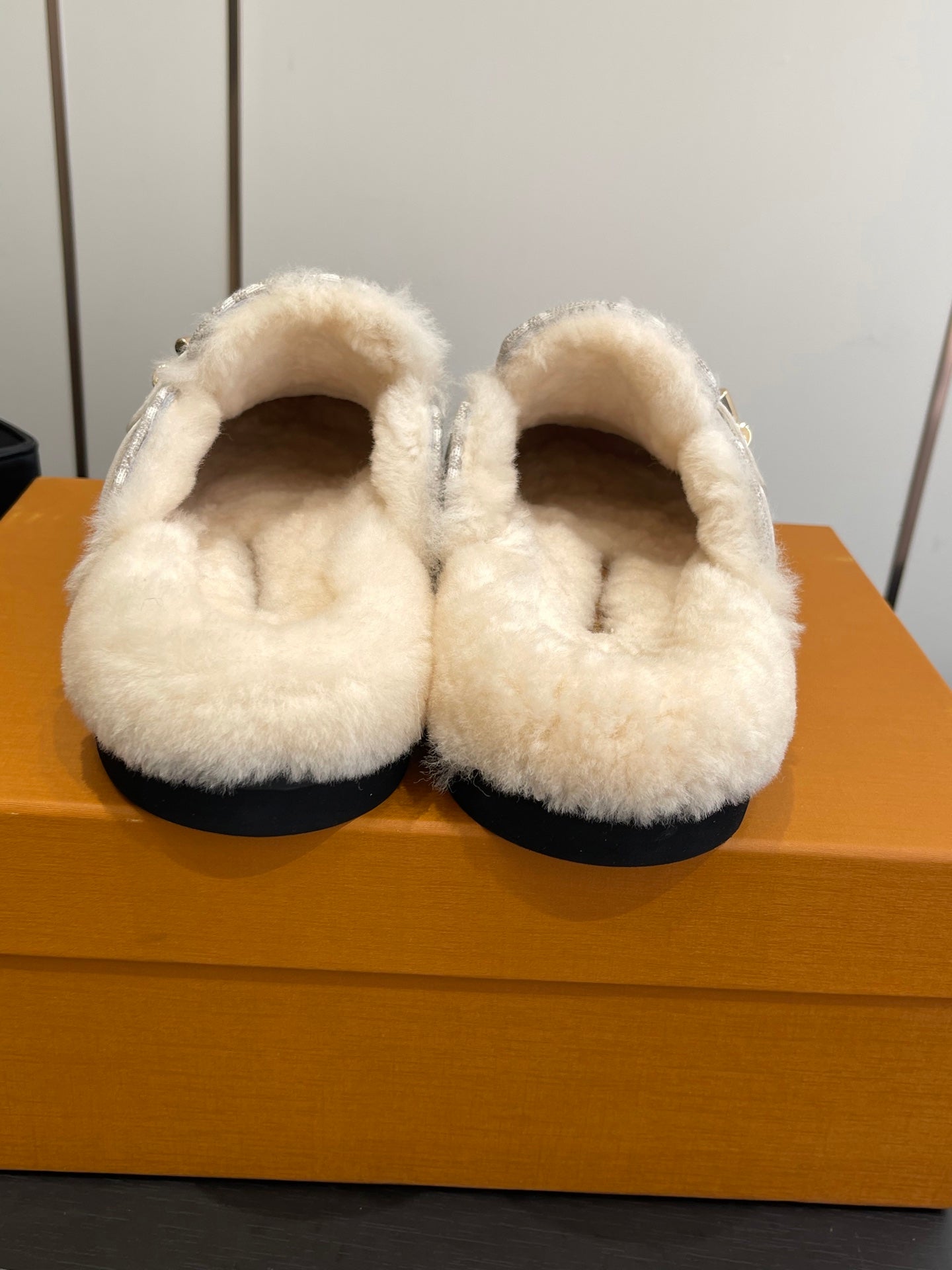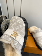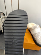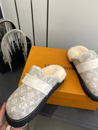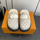LV Cosy Flat Slippers Comfort Clog Light Khaki Beige Leather Monogram Fur 533470
