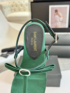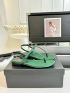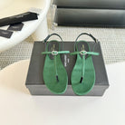 SL Silk Bow T-Strap Flat Sandals Green Leather
