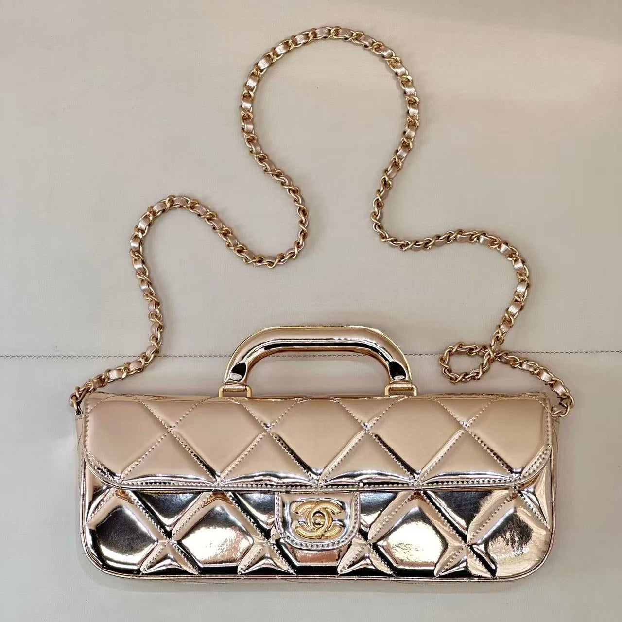 CC 25K Large Flap Bag with Top Handle Chain Strap Gold Metalic Patent Calfskin GHW