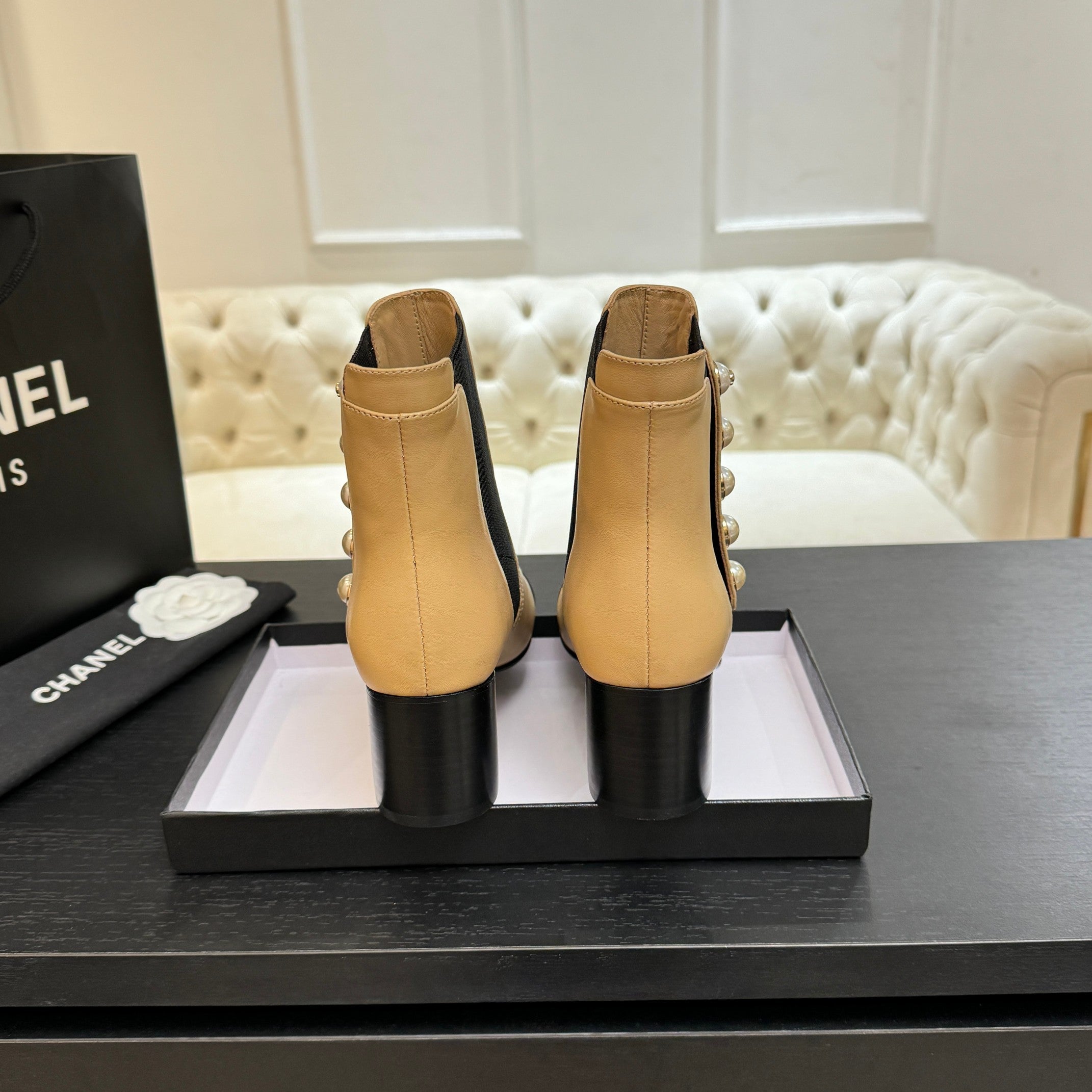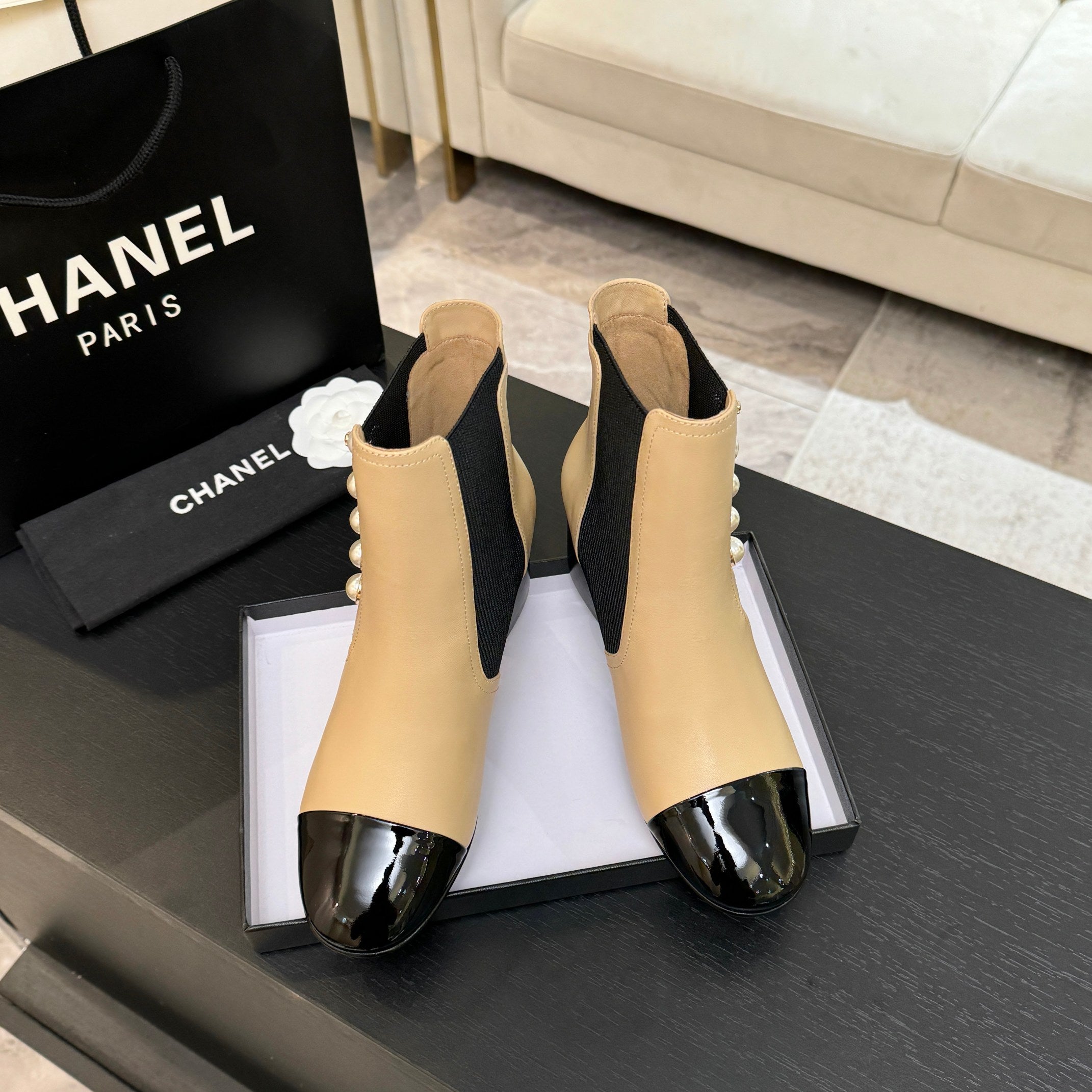 CC 25K Bow Chain Chunky Stretch Boots Beige Black Sheepskin 512073