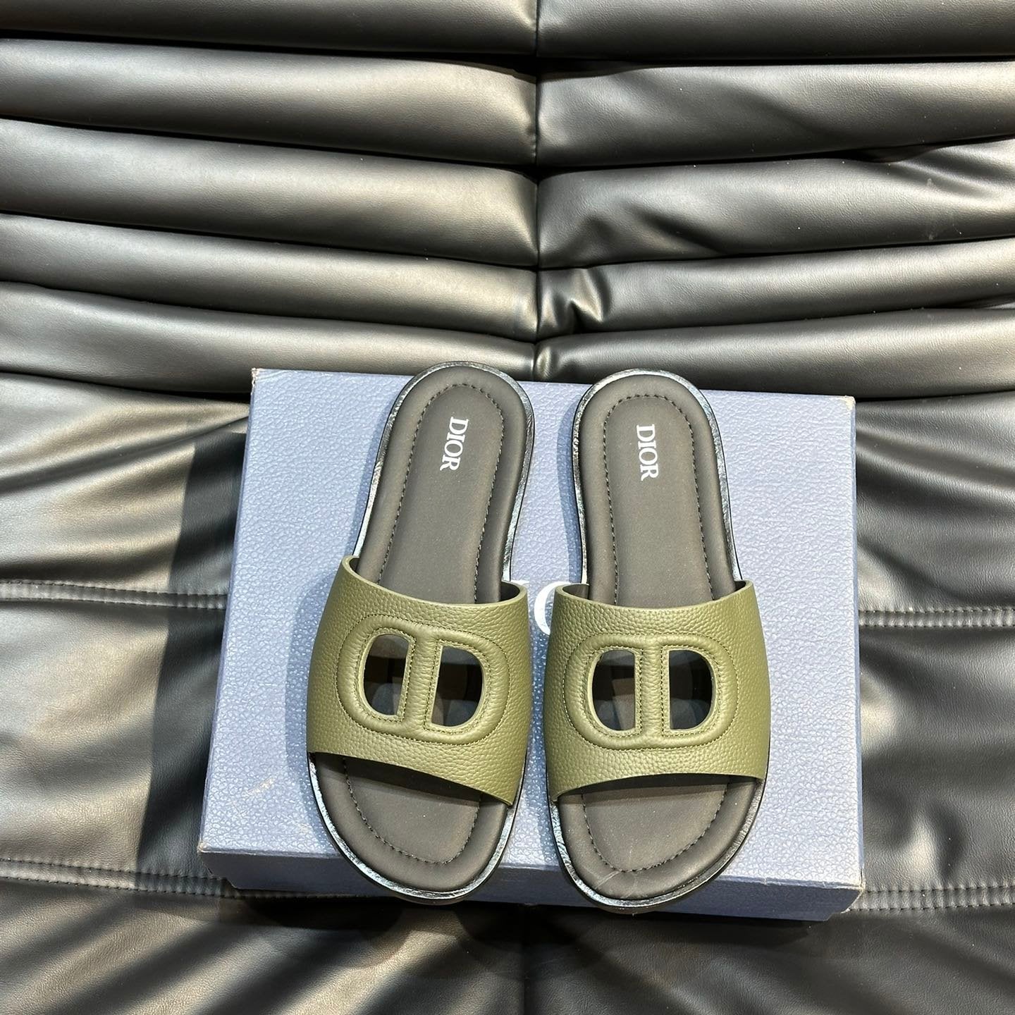 CD D-CLUB SLIDE SLIPPER OLIVE-JUNIPER GRAINED CALFSKIN