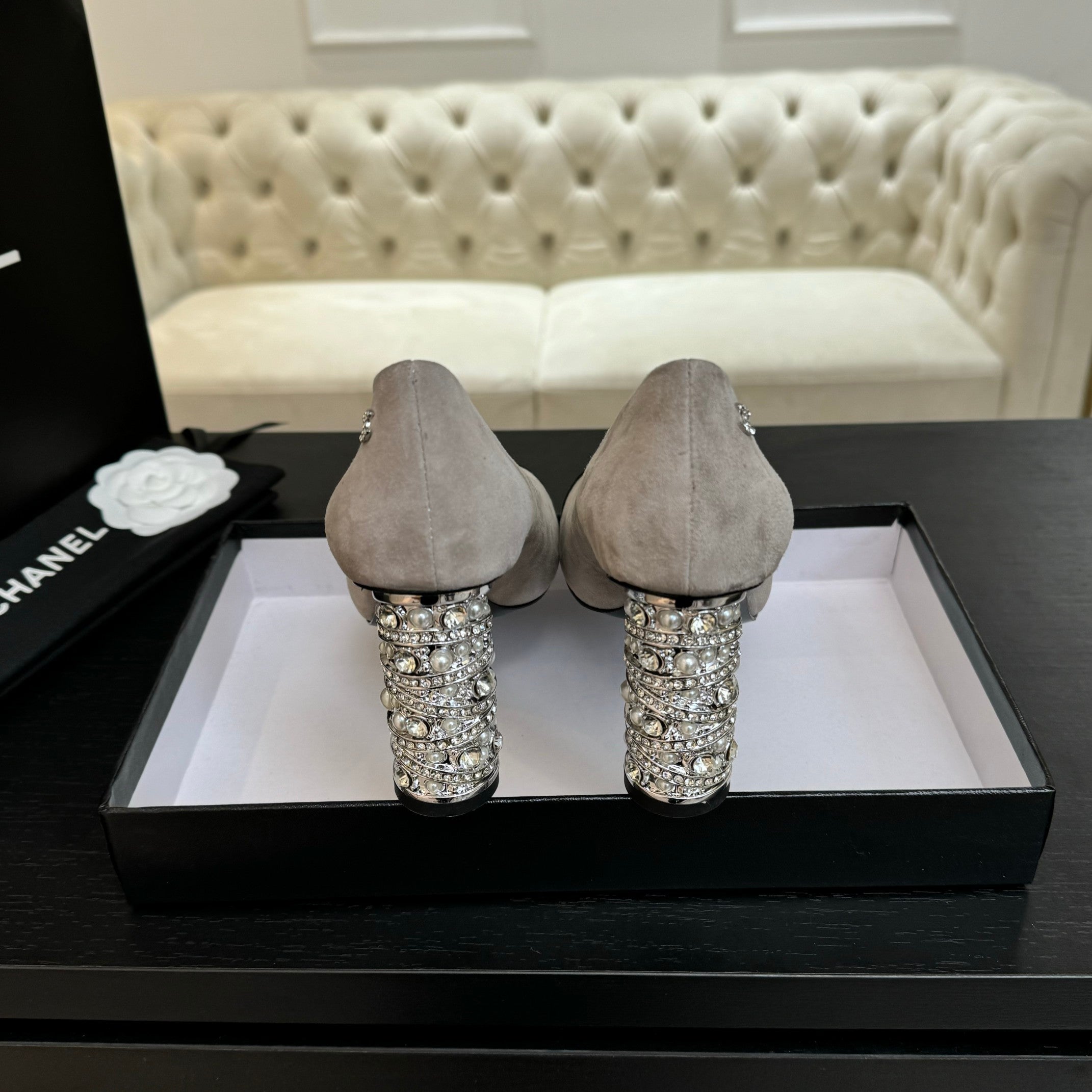 HIGH HEEL 85 MM SANDALS IN PALE GRAY SUEDE AND BLACK FABRIC
