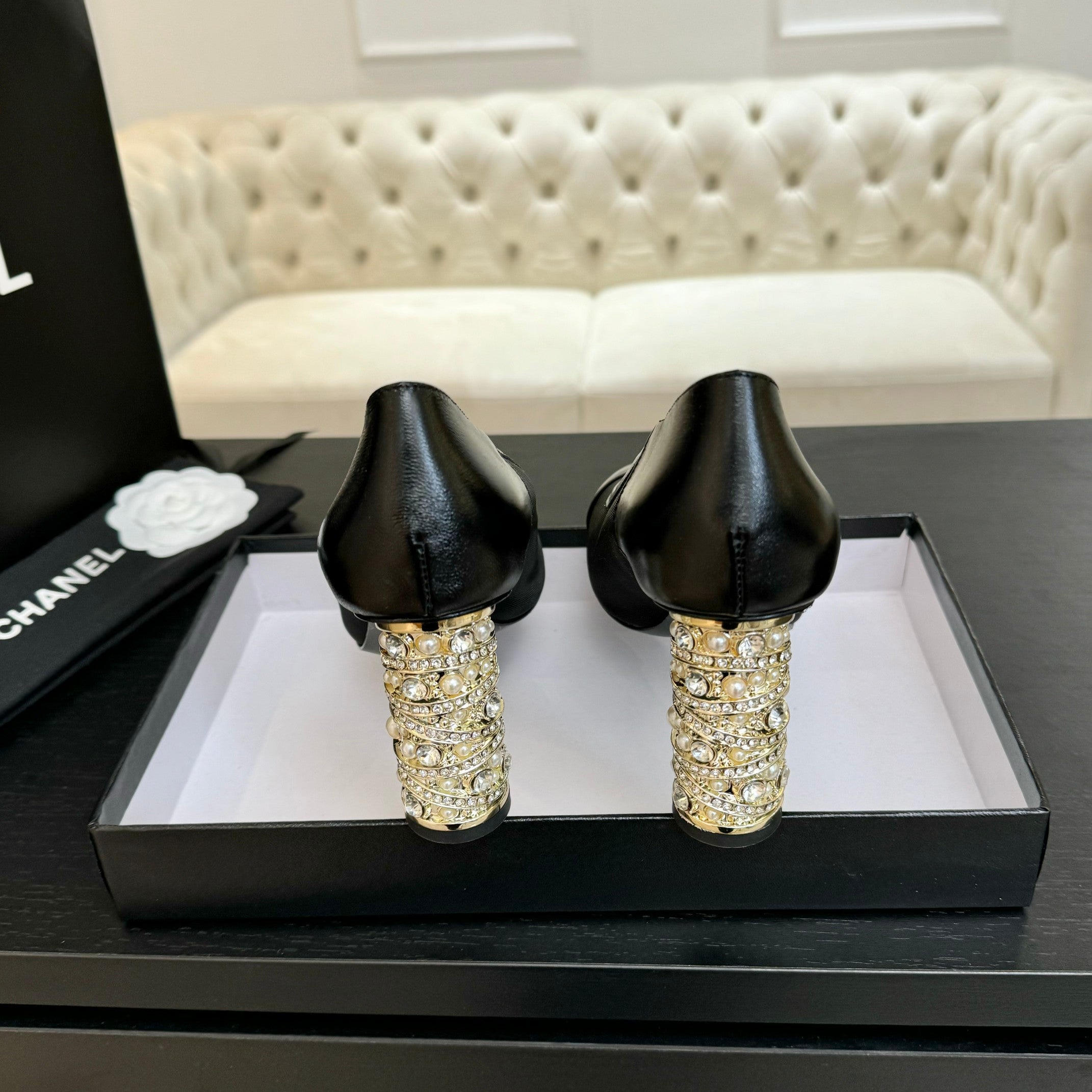 HIGH HEEL 75 MM SLINGBACK IN BLACK CALFSKIN WITH CRYSTAL