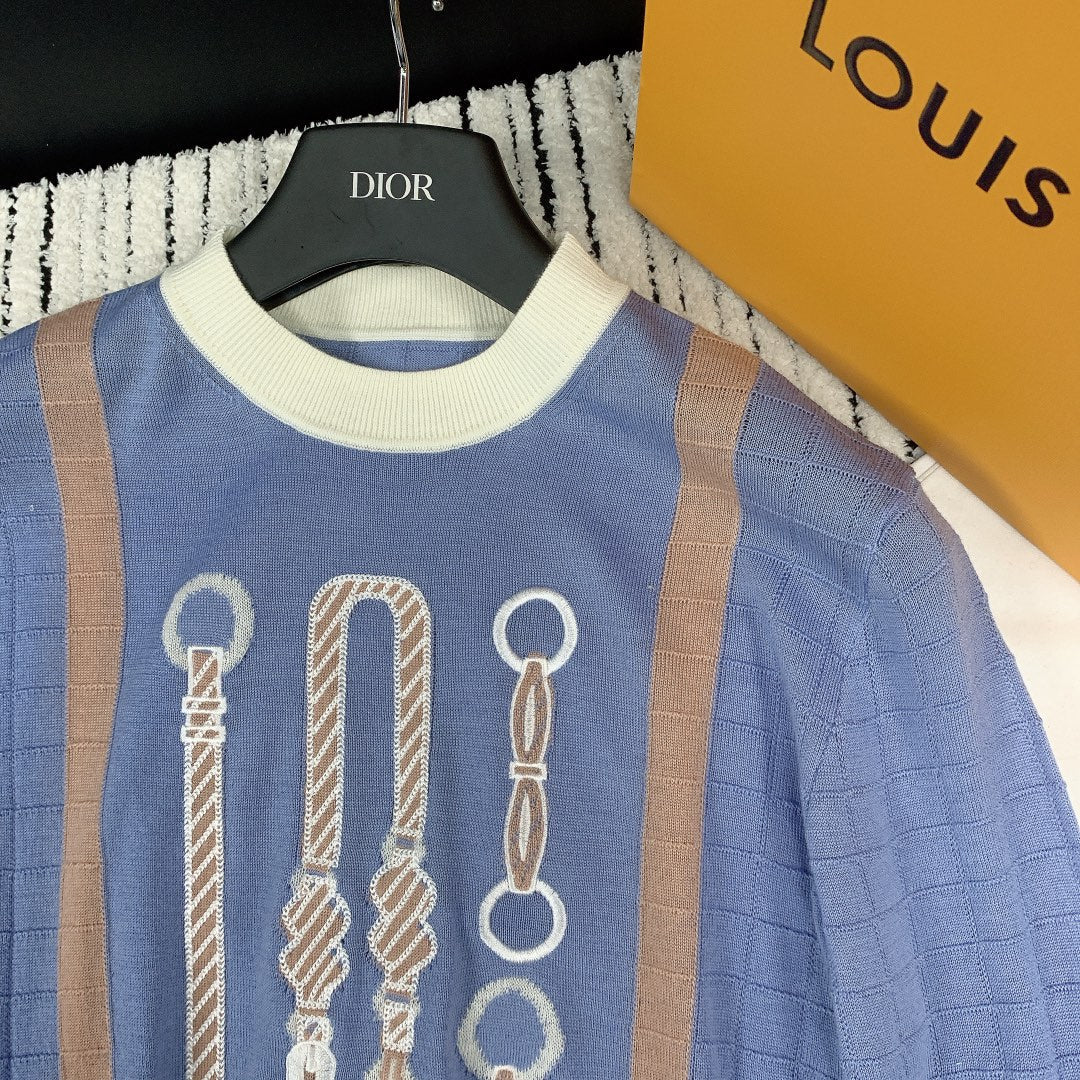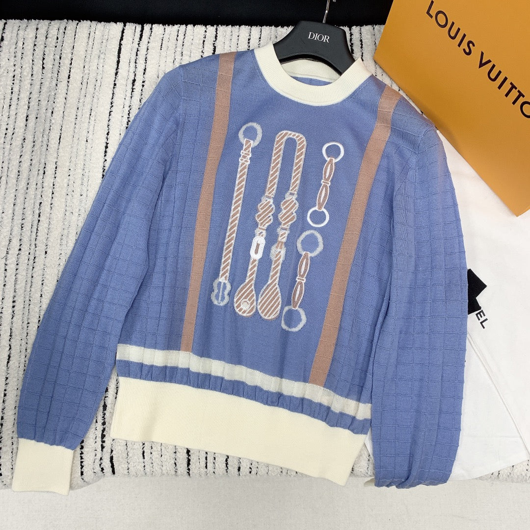 Hm 25 Print Patchwork Knit Top White Blue Tencel Wool