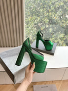 PLATFORM ANKLE STRAP HEELS IN GREEN METALLIC ATTACHED RHINESTONES CALFSKIN