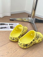 POOL GRAFFITI CROCS SLIDE SANDALS IN YELLOW AND BLACK RUBBER