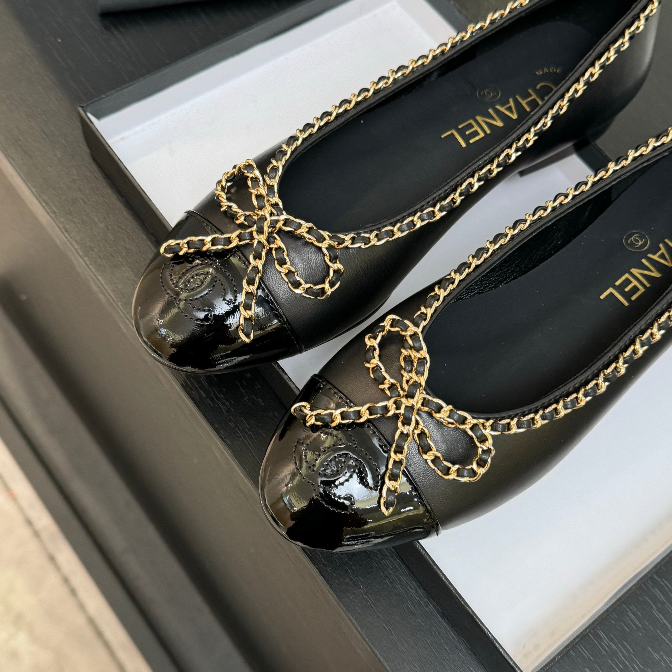 CC 25B ballet flat black patent calfskin leather chain