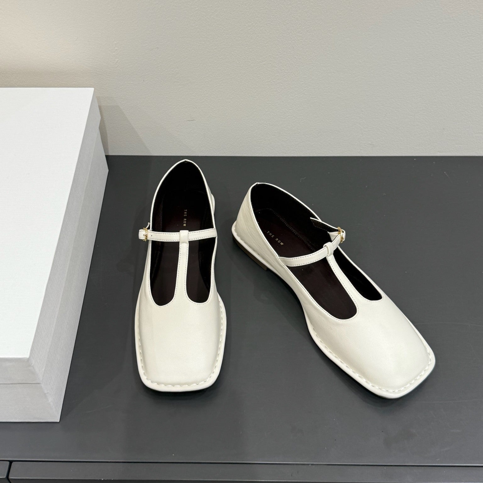 The Row Square T-Strap Flat White Sheepskin 337498