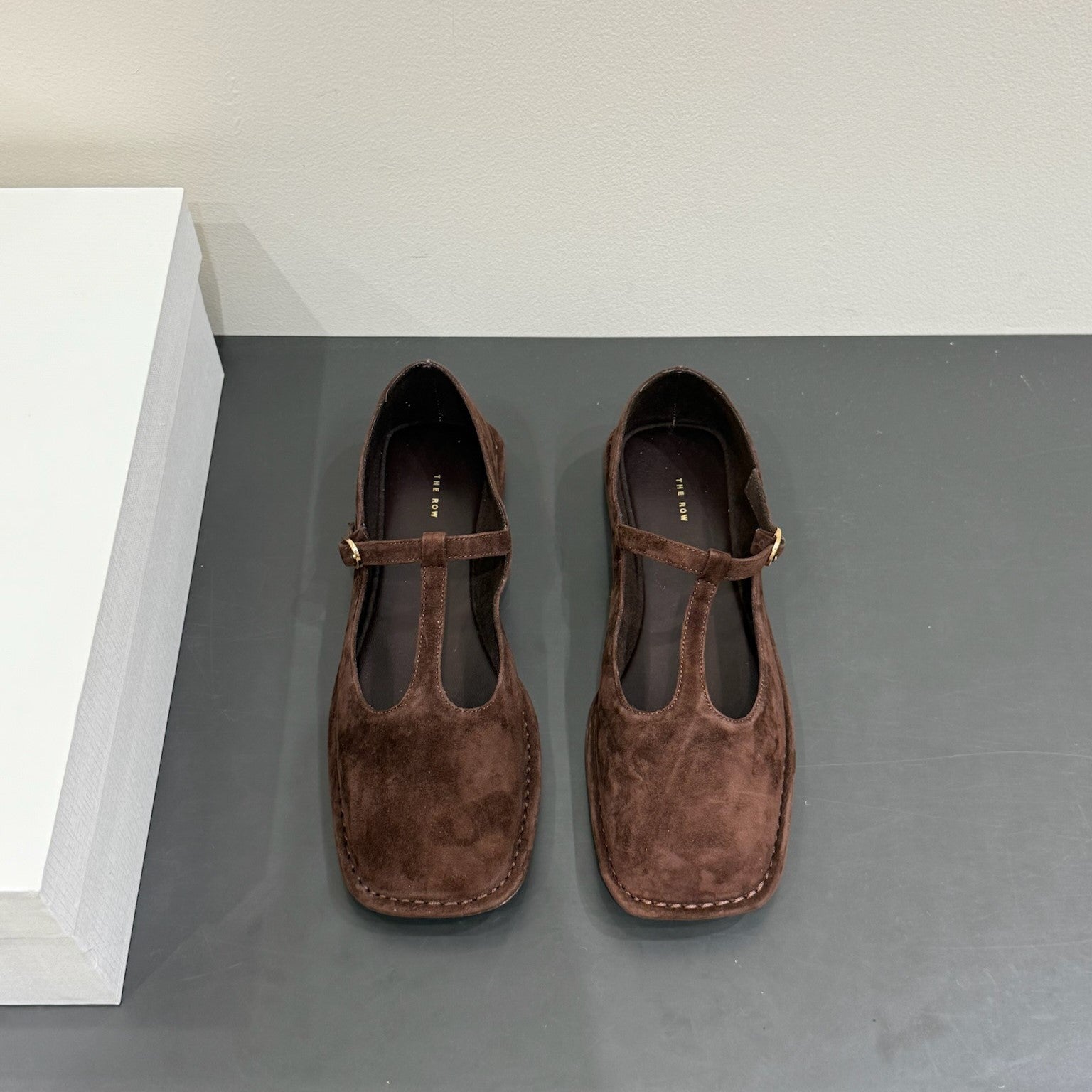 The Row Square T-Strap Flat Dark Brown Suede 337499