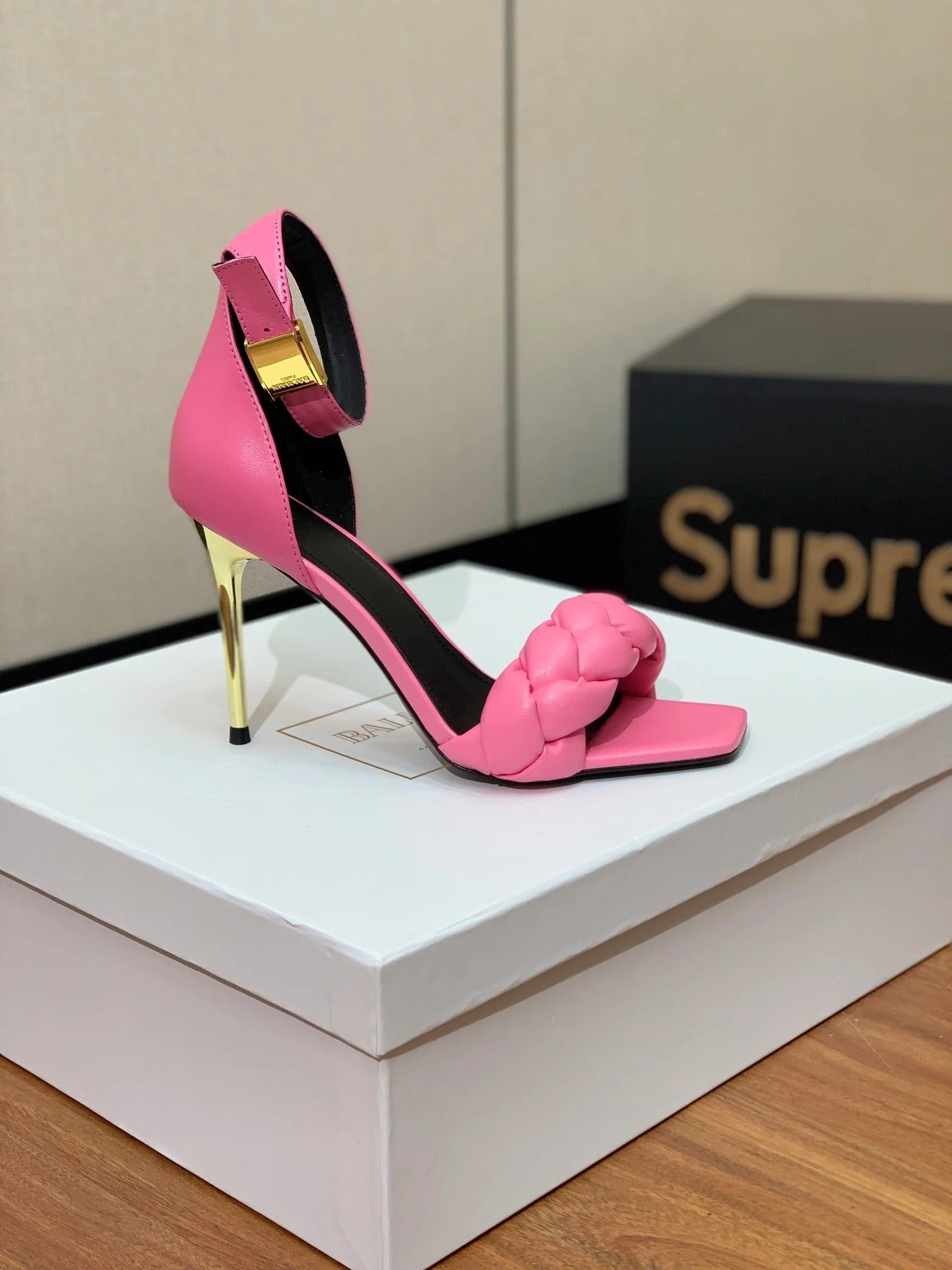 BALMAIN 25S ANKLE STRAP HIGH HEEL 95MM IN PINK CALFSKIN