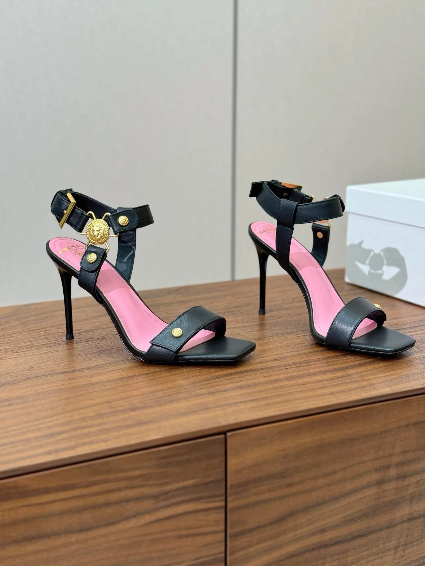 BALMAIN 25S HEELED EVA SANDALS 95MM IN BLACK AND PINK CALFSKIN