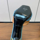 BALMAIN 25S HIGH HEEL MULES 95MM IN WARM CARAMEL DENIM AND CALFSKIN