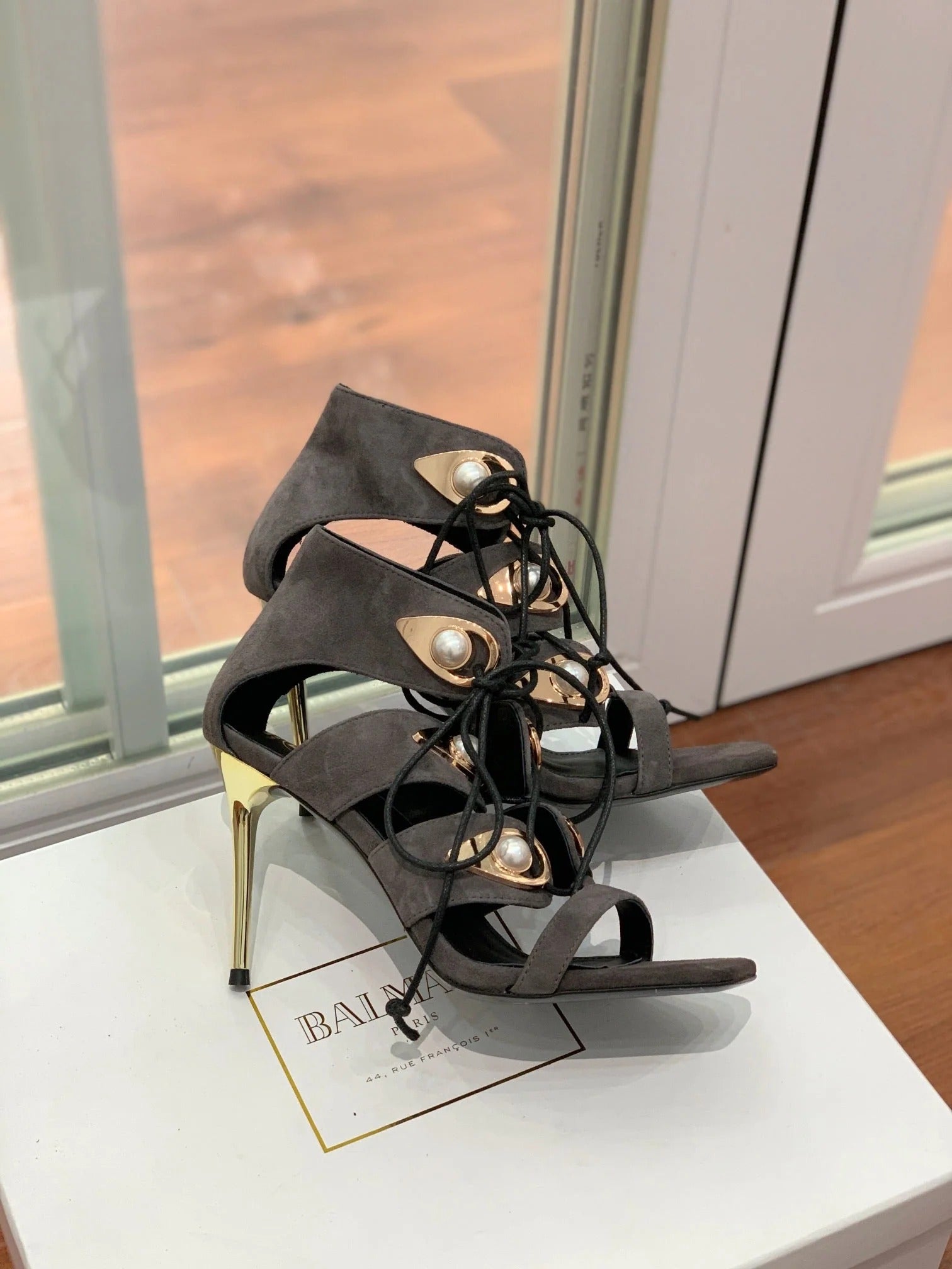 BALMAIN 25S HIGH HEELS 95MM IN CHARCOAL BROWN SUEDE WITH PEARL