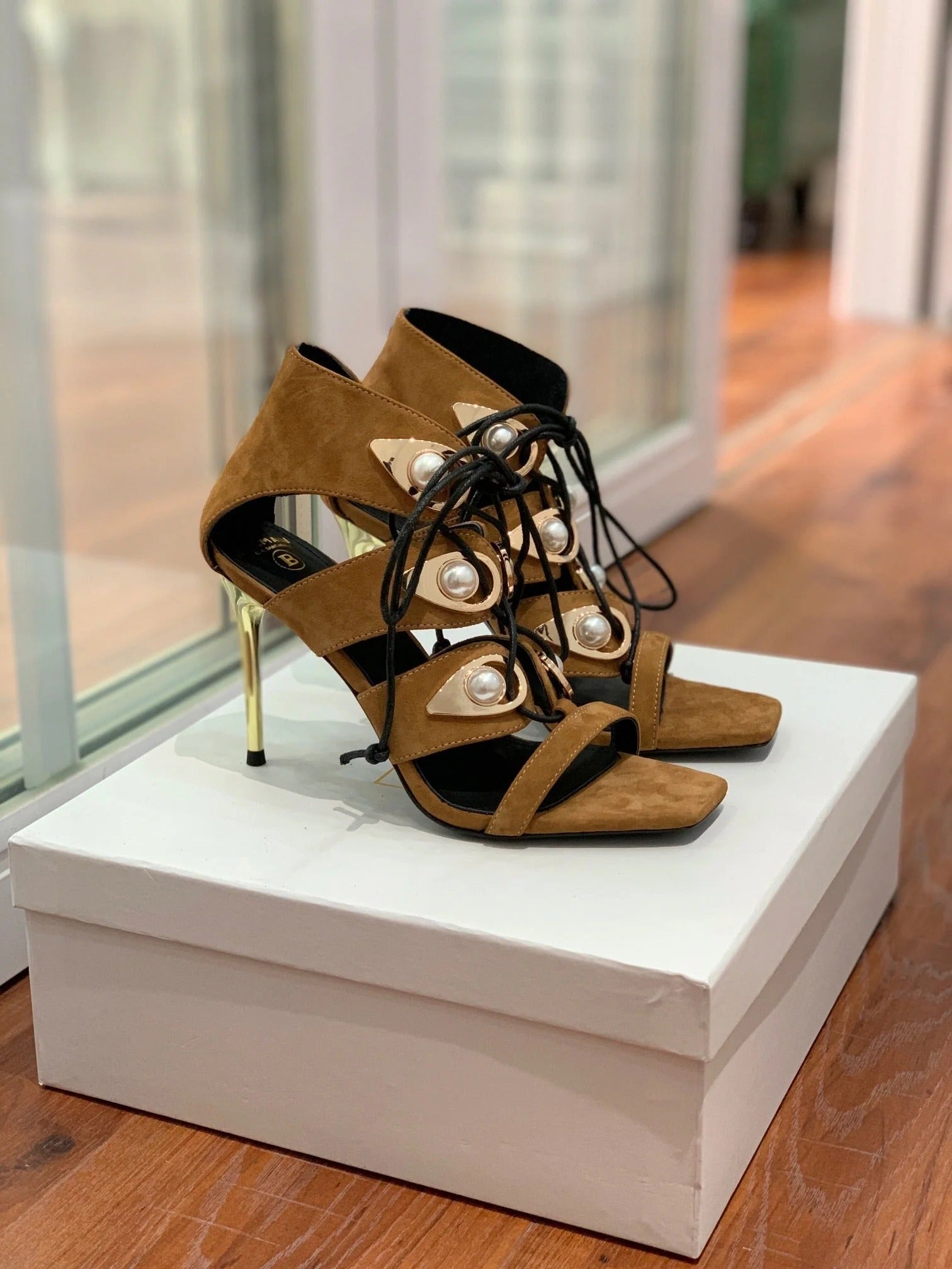 BALMAIN 25S HIGH HEELS 95MM IN DARK BROWN SUEDE WITH PEARL