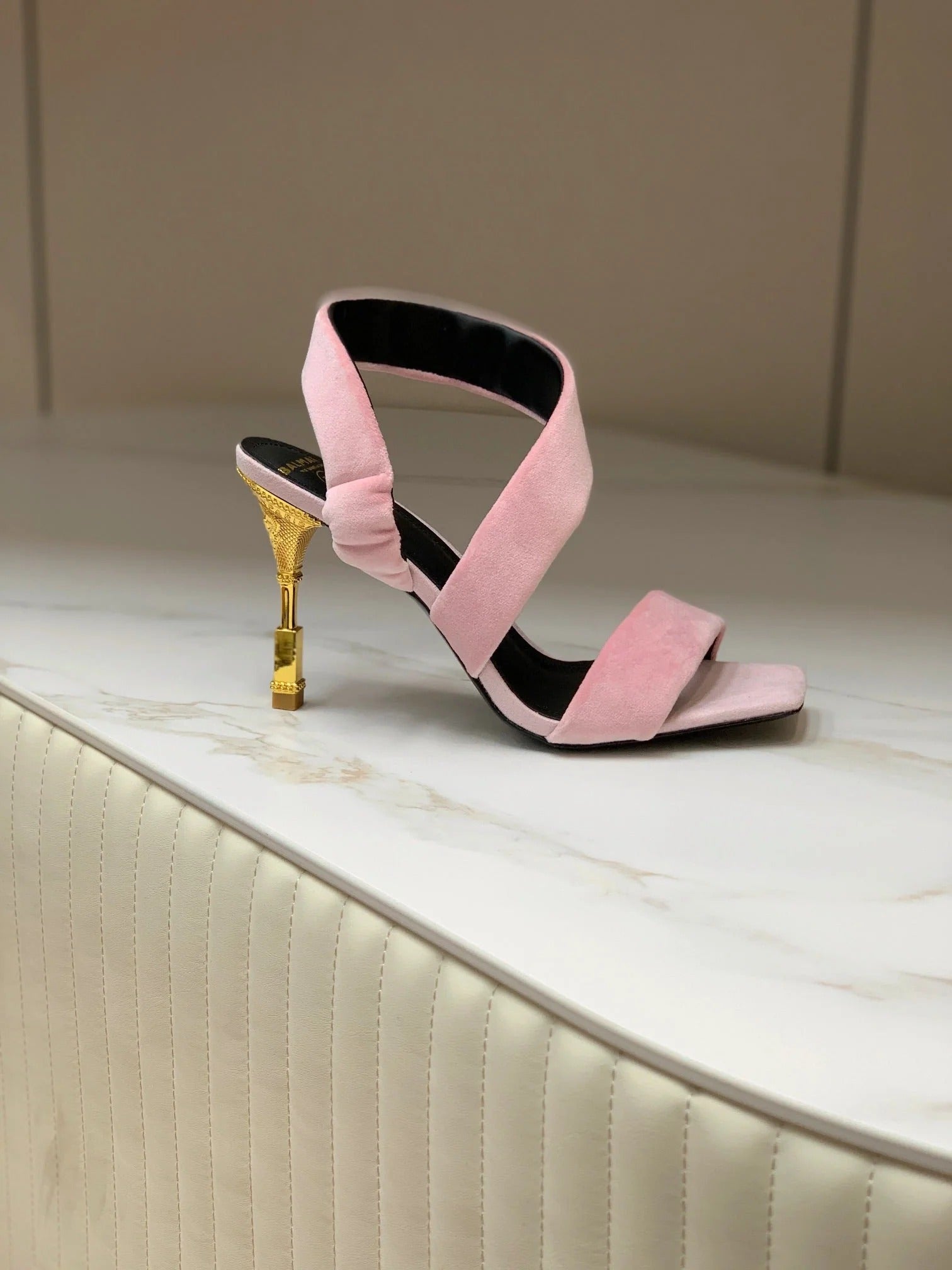 BALMAIN 25S MONETA HEELED SANDALS 95MM IN BABY PINK VELVET