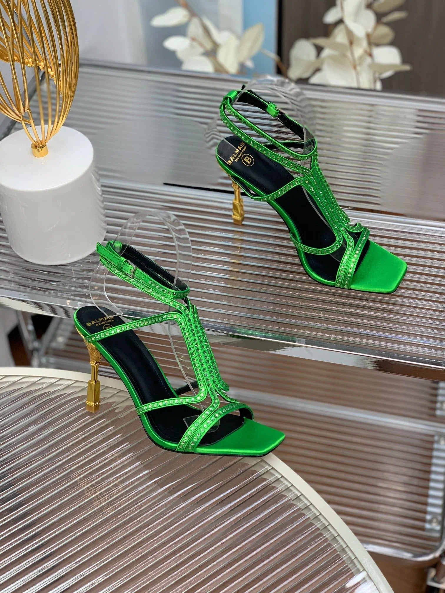 BALMAIN 25S MONETA SANDAL 95MM IN DARK GREEN CALFSKIN WITH CRYSTAL