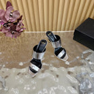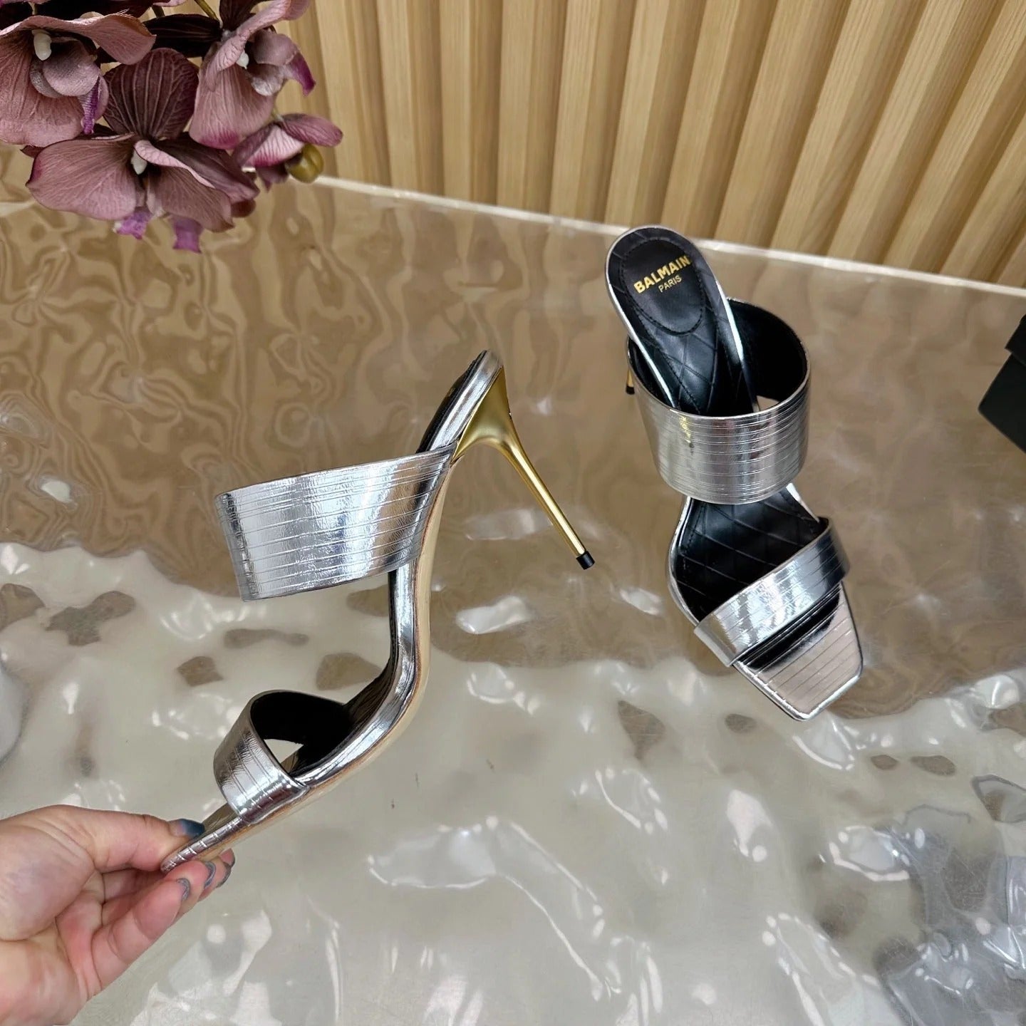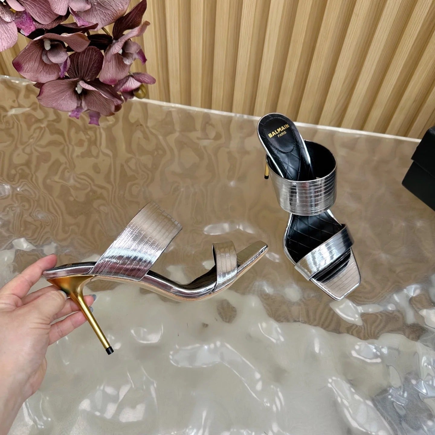 BALMAIN 25S MULES IN STRIPED LEATHER 95MM IN SILVER CALFSKIN