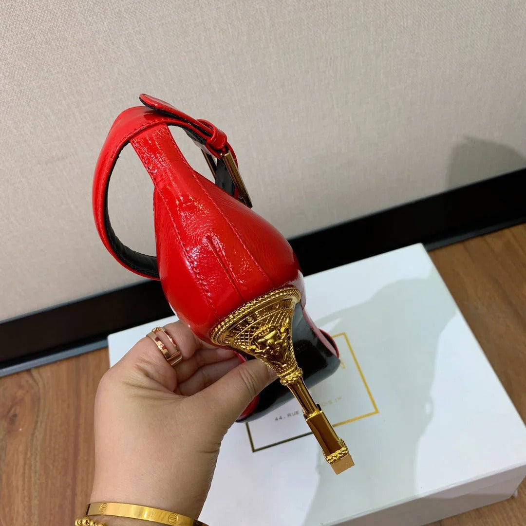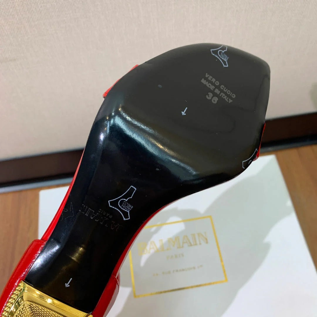 BALMAIN 25S SQUARE STRAP HIGH HEELS 100MM IN RED PATENT CALFSKIN