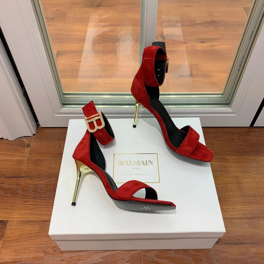 BALMAIN 25S THIN STRAP HIGH HEELS 105MM IN DARK RED SUEDE GOLD HARDWARE