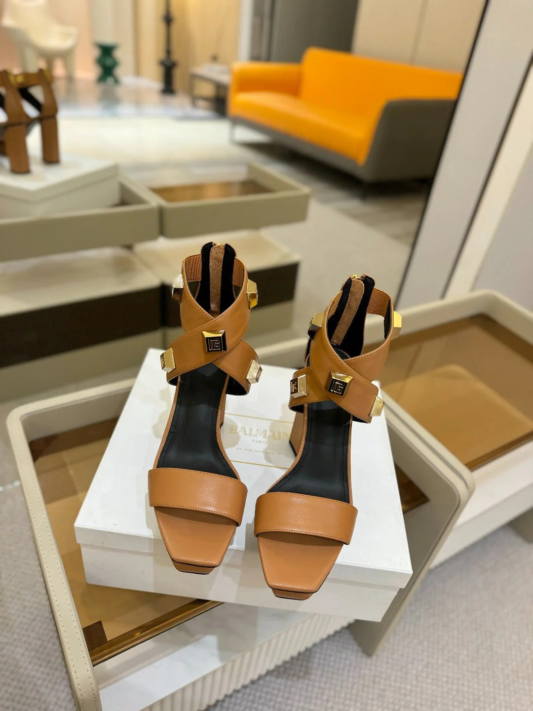 BALMAIN 25S WEDGE HEELS 105MM IN DARK BROWN CALFSKIN GOLD HARDWARE