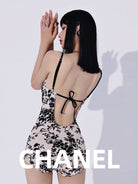 CC BIKINI SWIMSUIT SET IN IVORY WITH BLACK VELVET FLORAL EMBROIDERY 581303