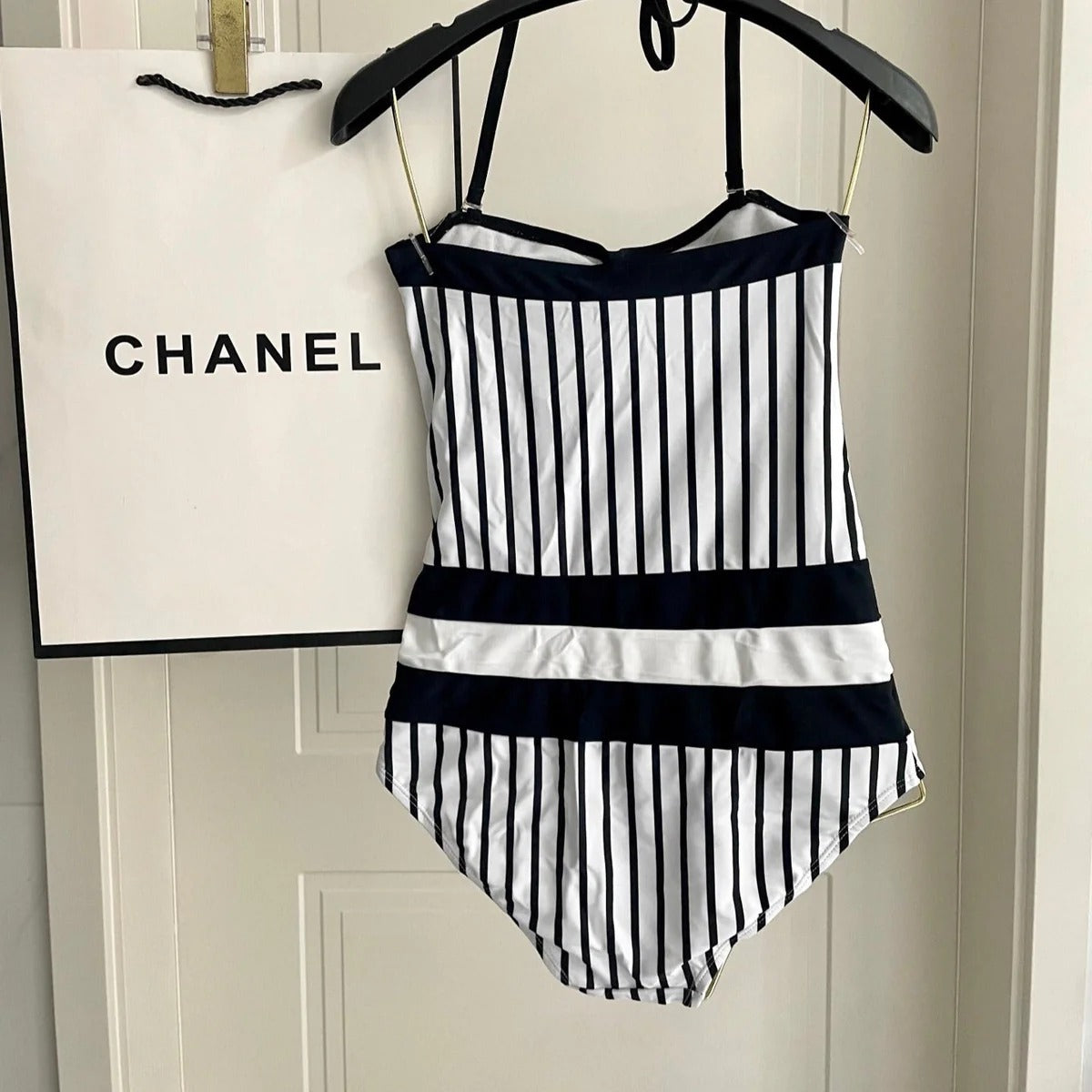 CC BIKINI SWIMSUIT SET IN WHITE WITH BLACK VERTICAL STRIPES 633258