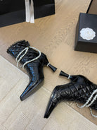 HIGH HEELS 8CM BOOTS IN BLACK CALFSKIN WITH PEARL CHAIN