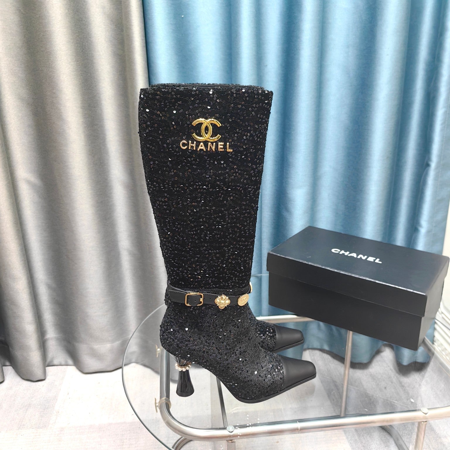 CC High Boots In Black Mix White Wool Tweed And Lambskin
