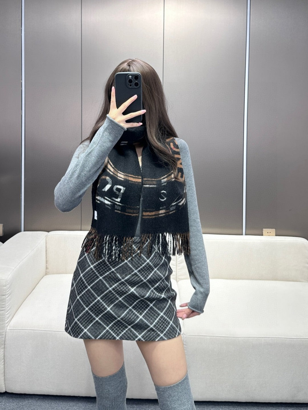 SCARF 180 CM IN BLACK AND RUSSET BROWN CASHMERE 407241