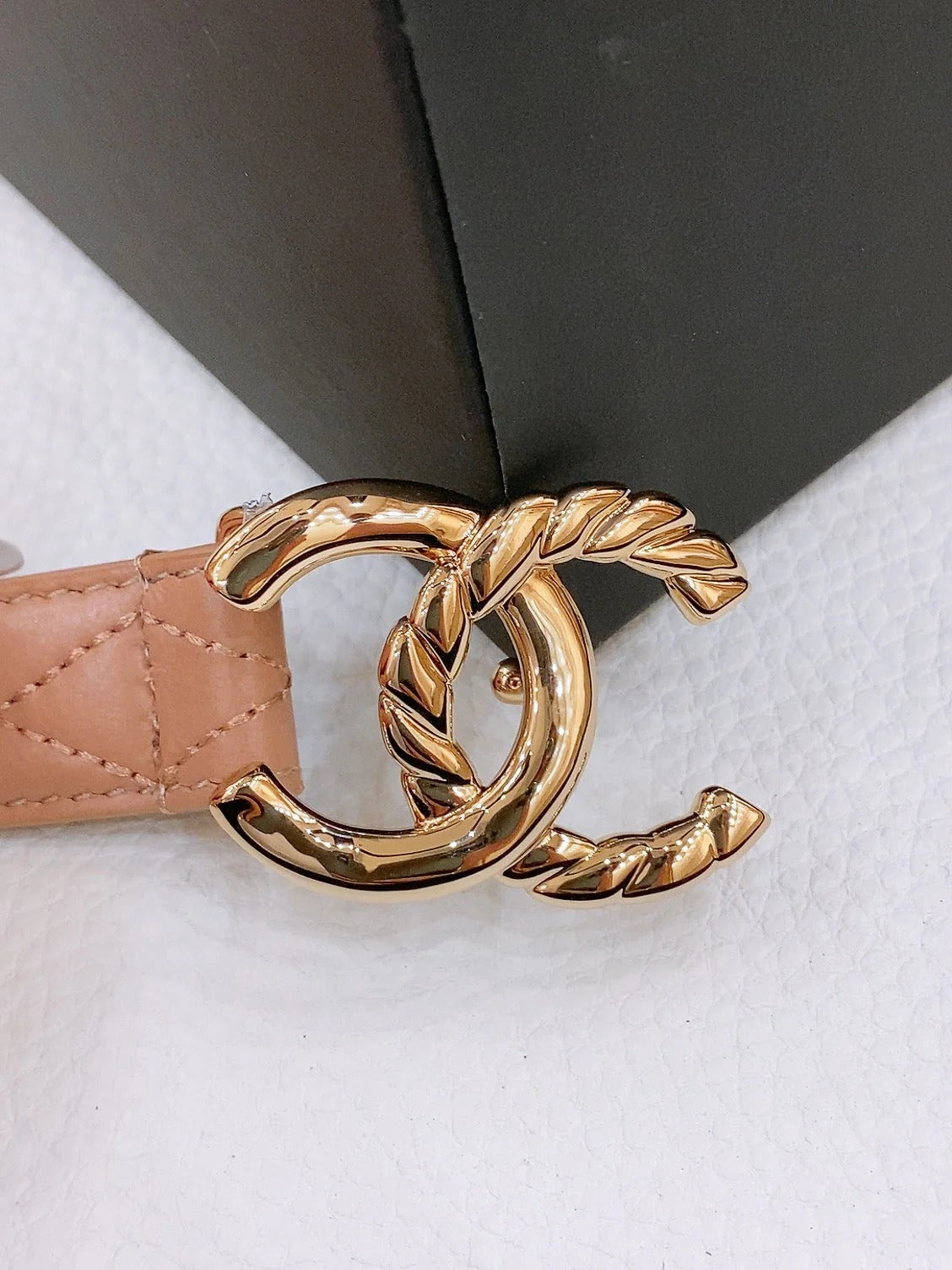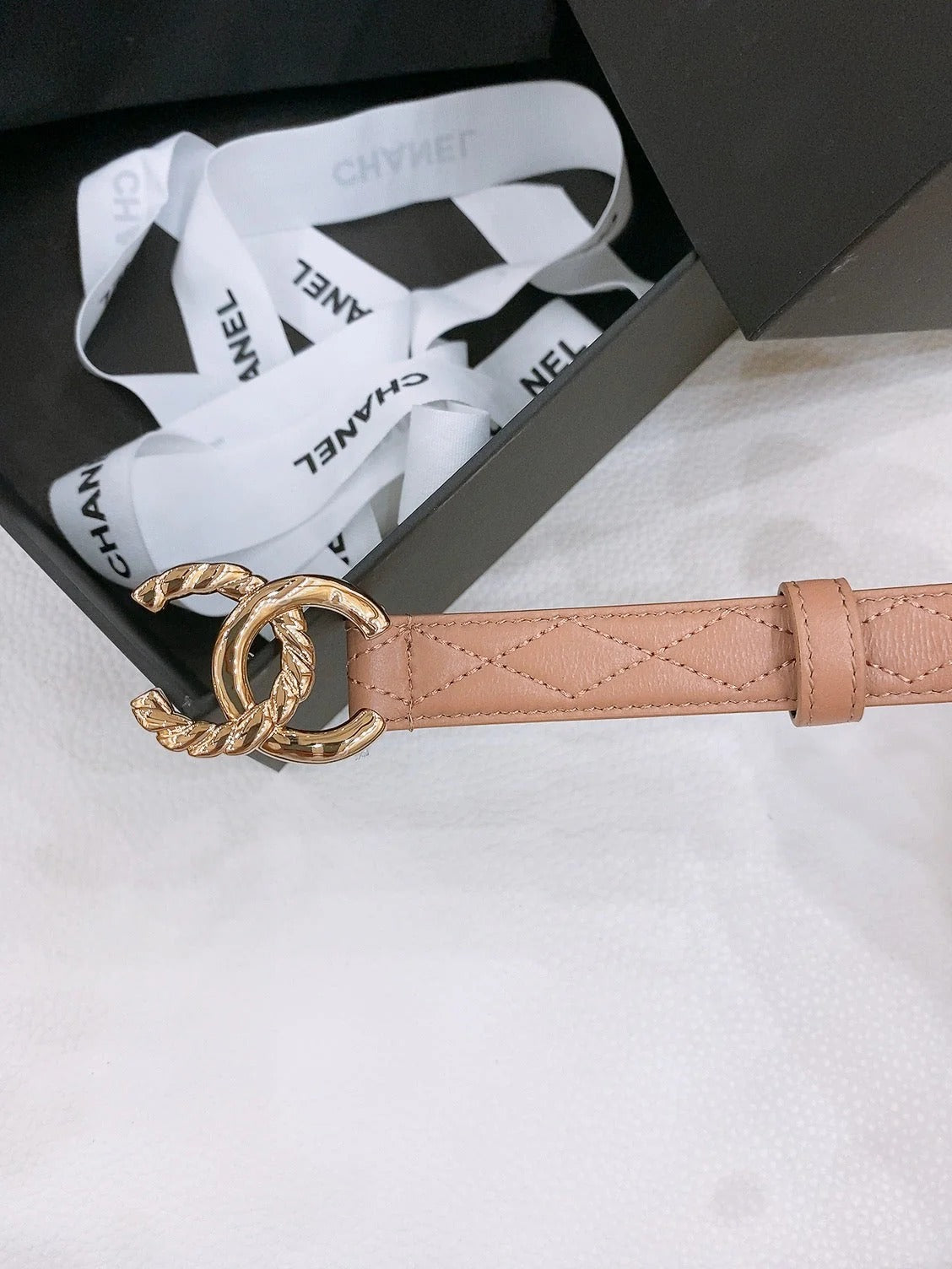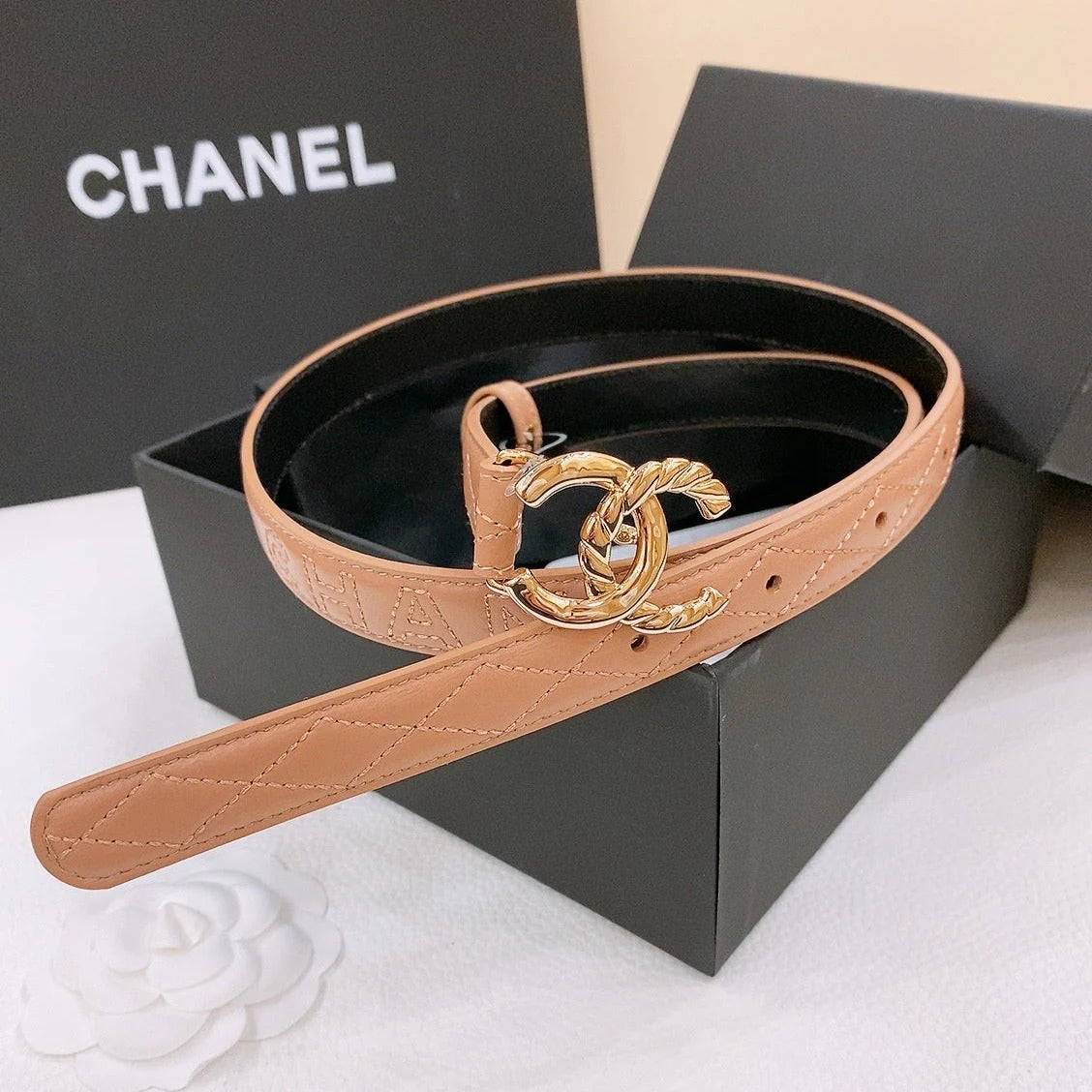 DOUBLE C BELT 20MM IN SAVANNA BROWN CALFSKIN WITH QUILTED STITCHING SPIRAL GOLD BUCKLE