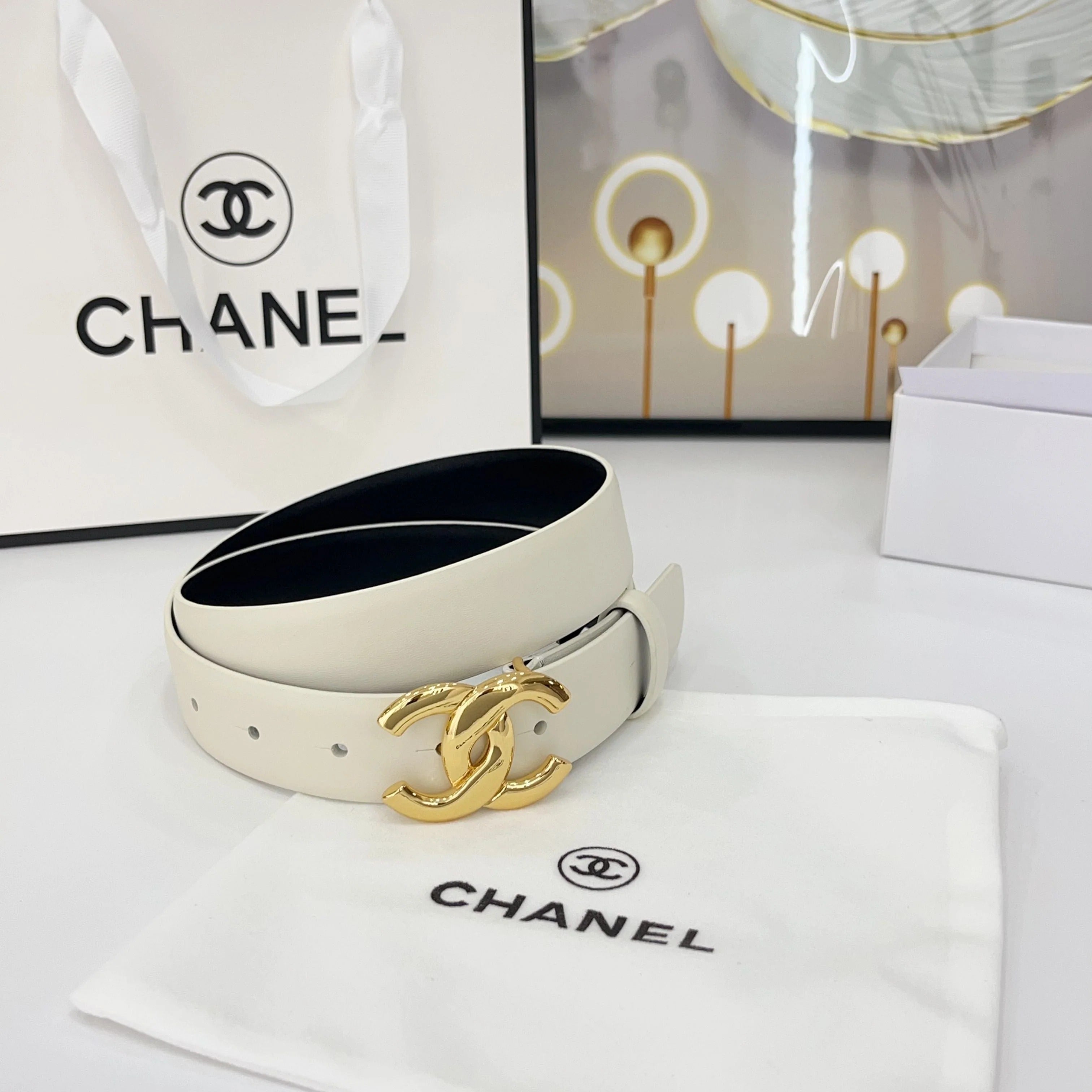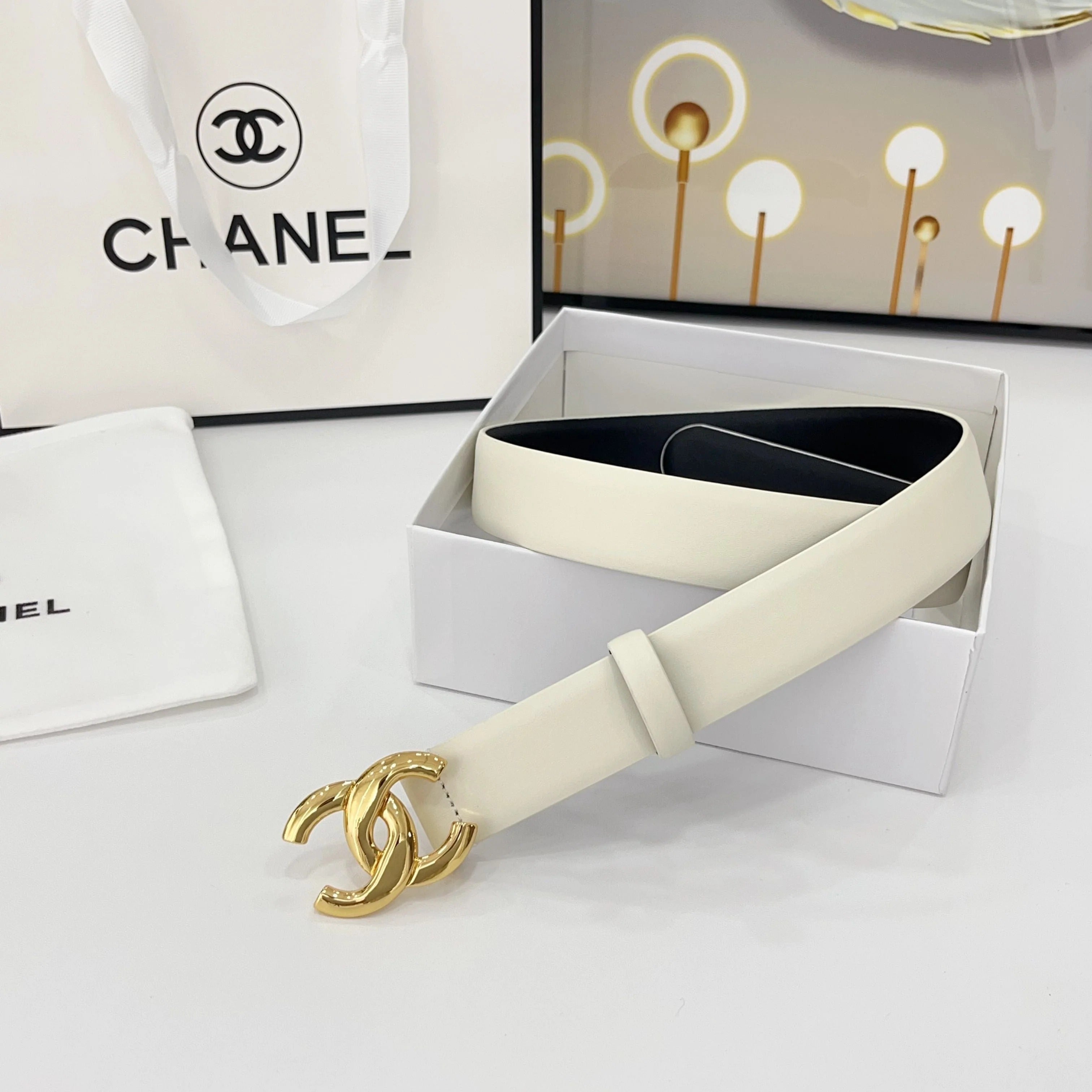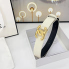 DOUBLE C BELT 30MM IN WHITE CALFSKIN WITH SHINY GOLD BUCKLE